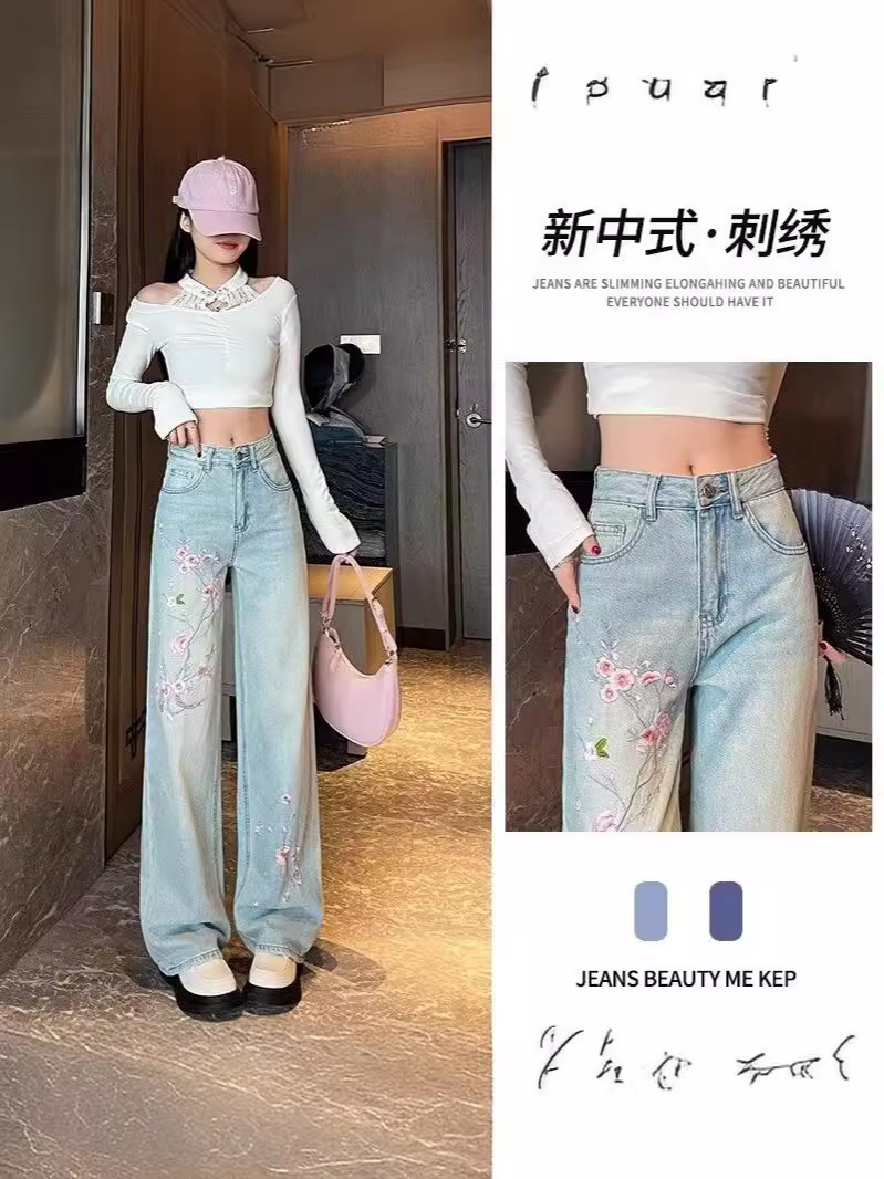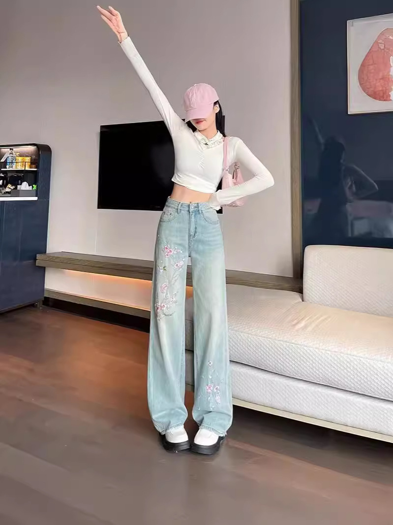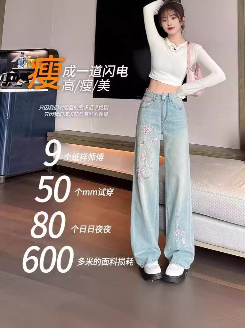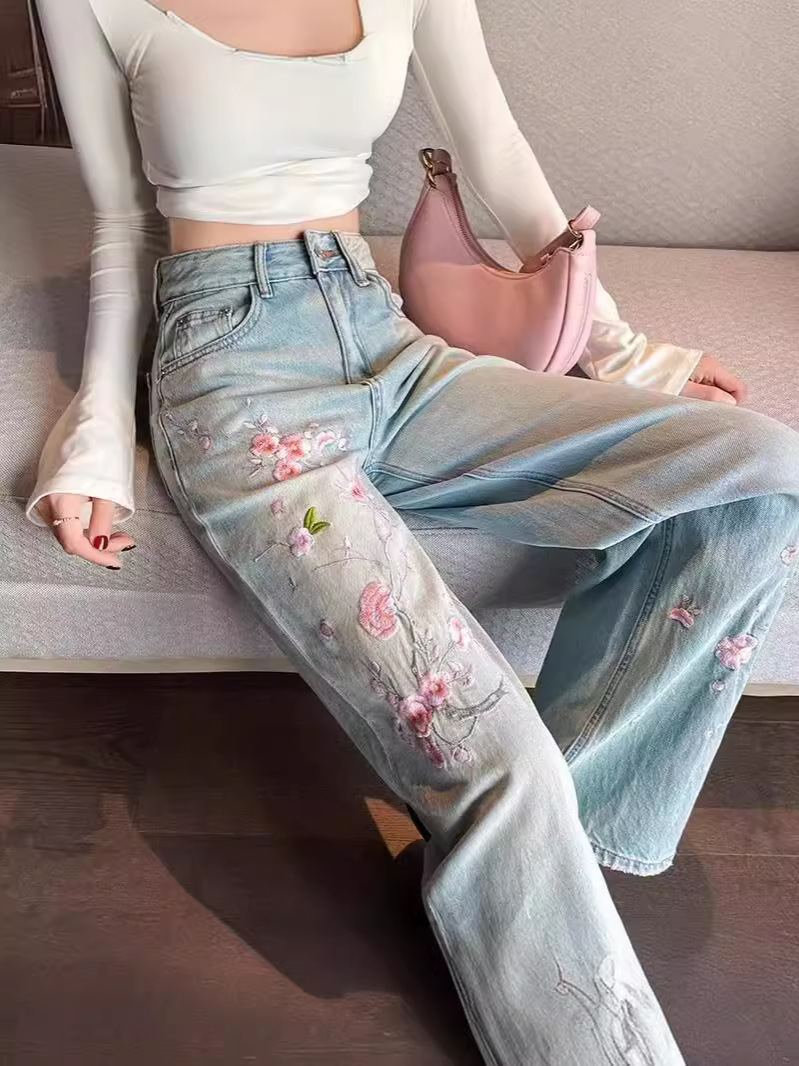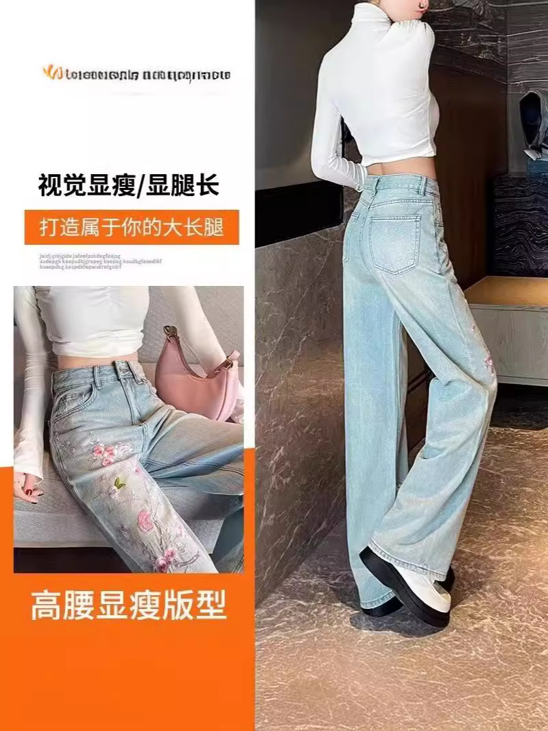 Главная страница > Розовые цветы вышитые джинсы женский летний новый китайский стиль с высокой талией, тонкие широкие брюки, стирка светлые прямые брюки