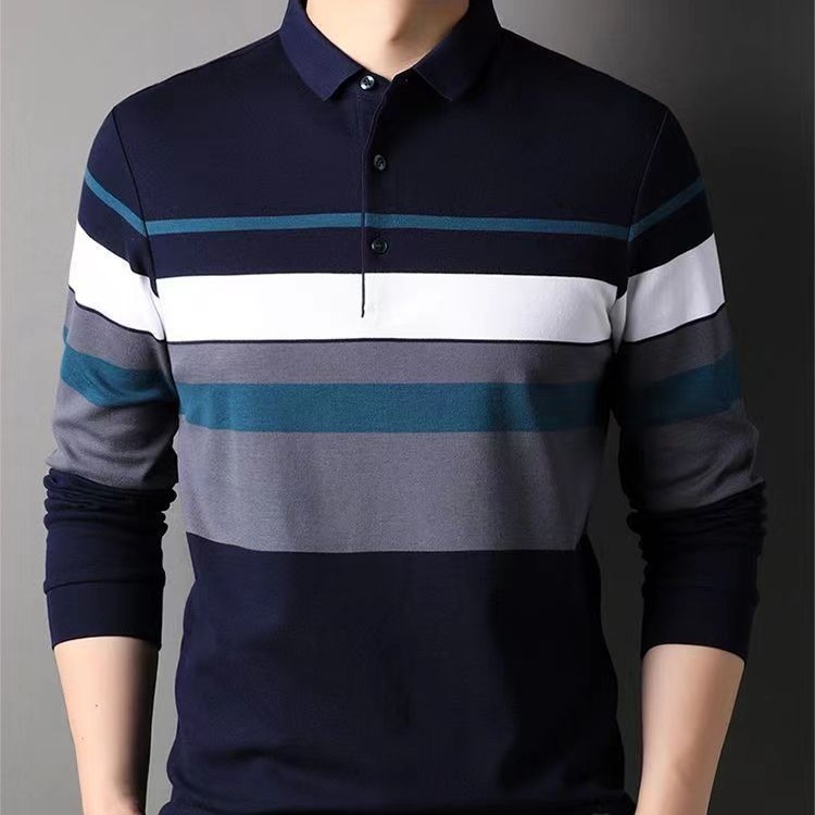 Главная страница > Весенняя мужская футболка с длинными рукавами и воротником в стиле "dad-style", с полосатыми настоящими карманами, базовая футболка для мужчин среднего возраста с антистатической обработкой.