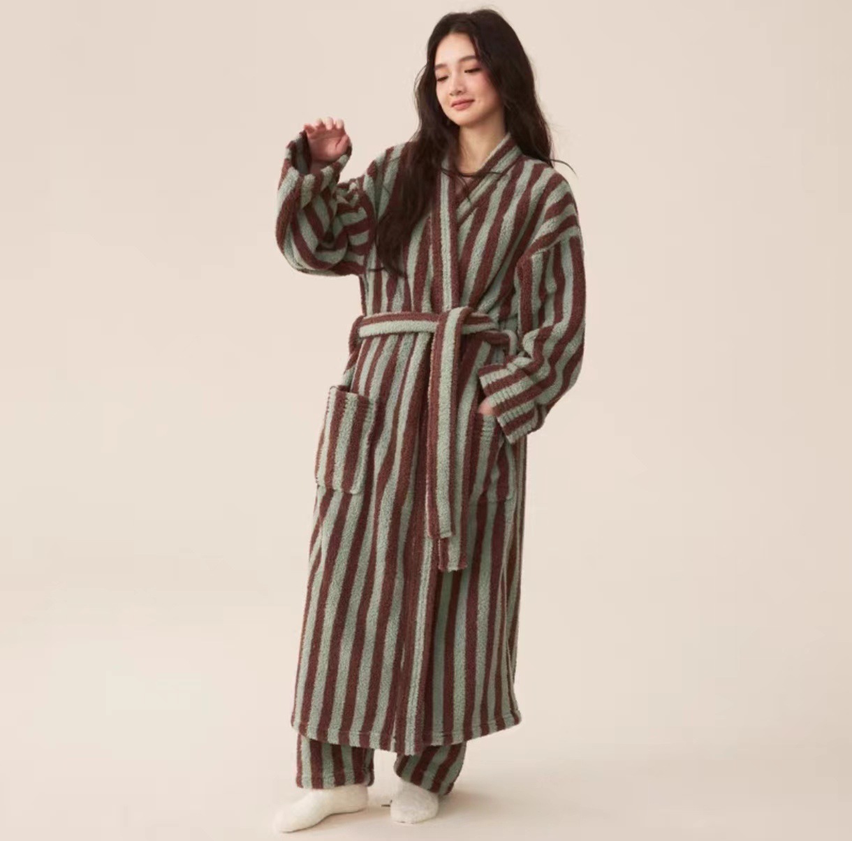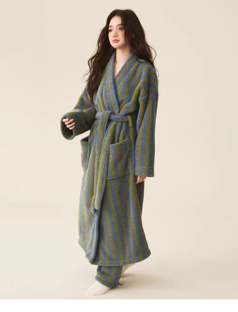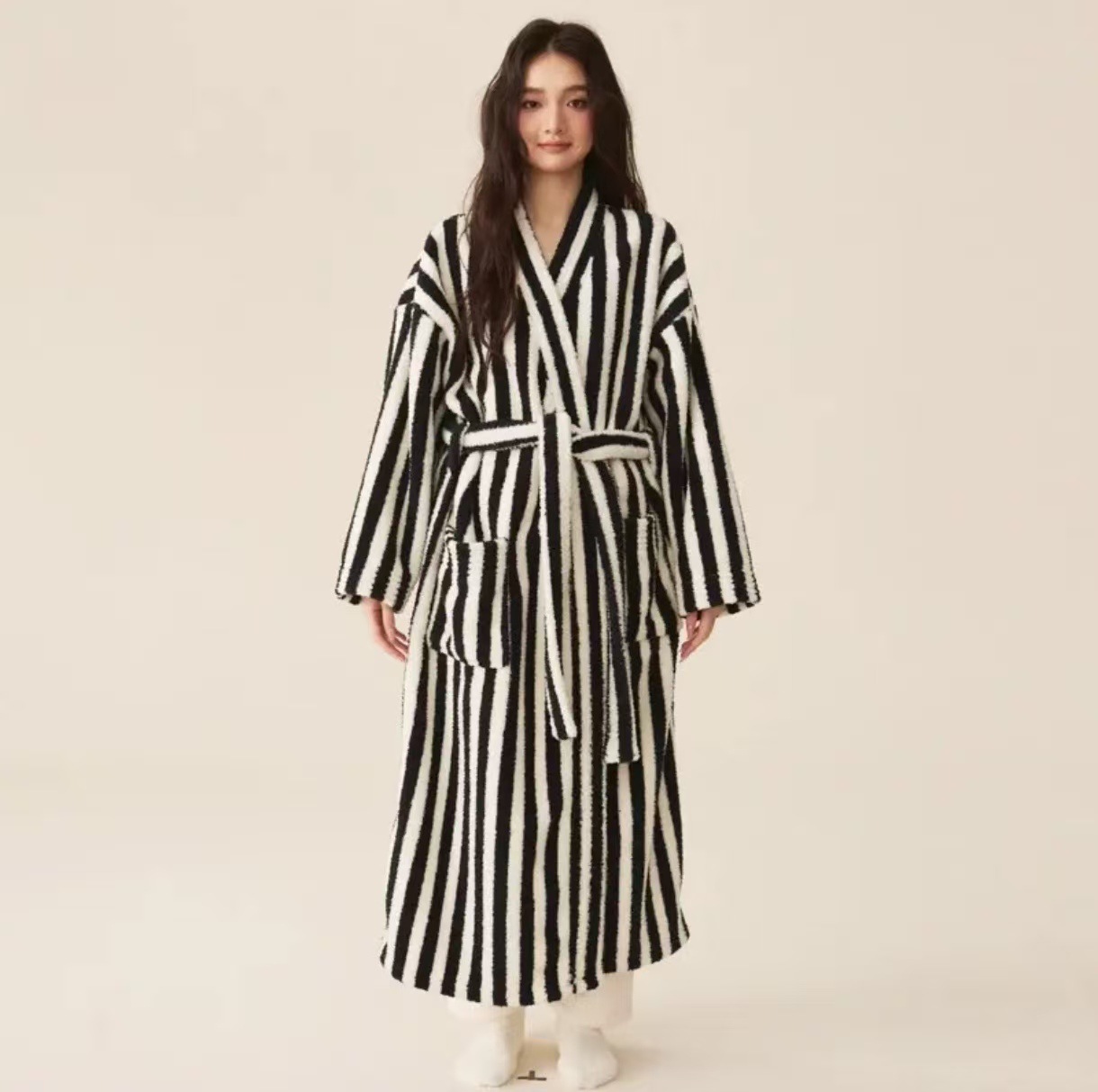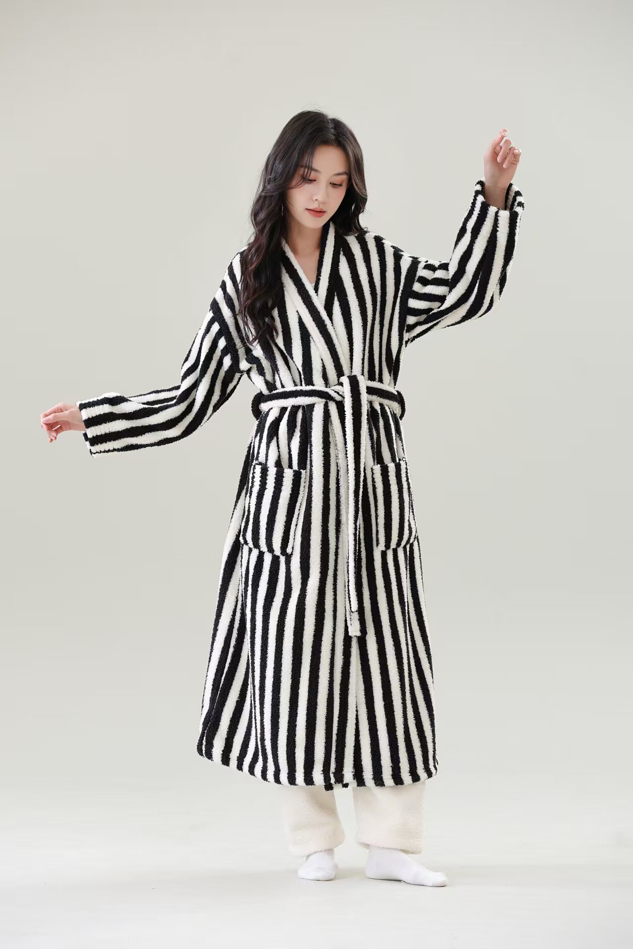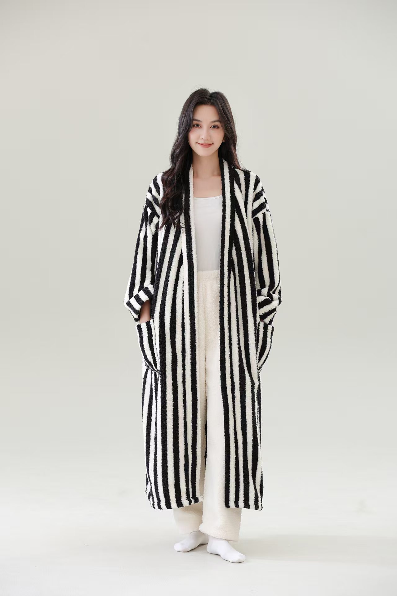 Женский одинарный халат из рисового бархата в черно-белую полоску