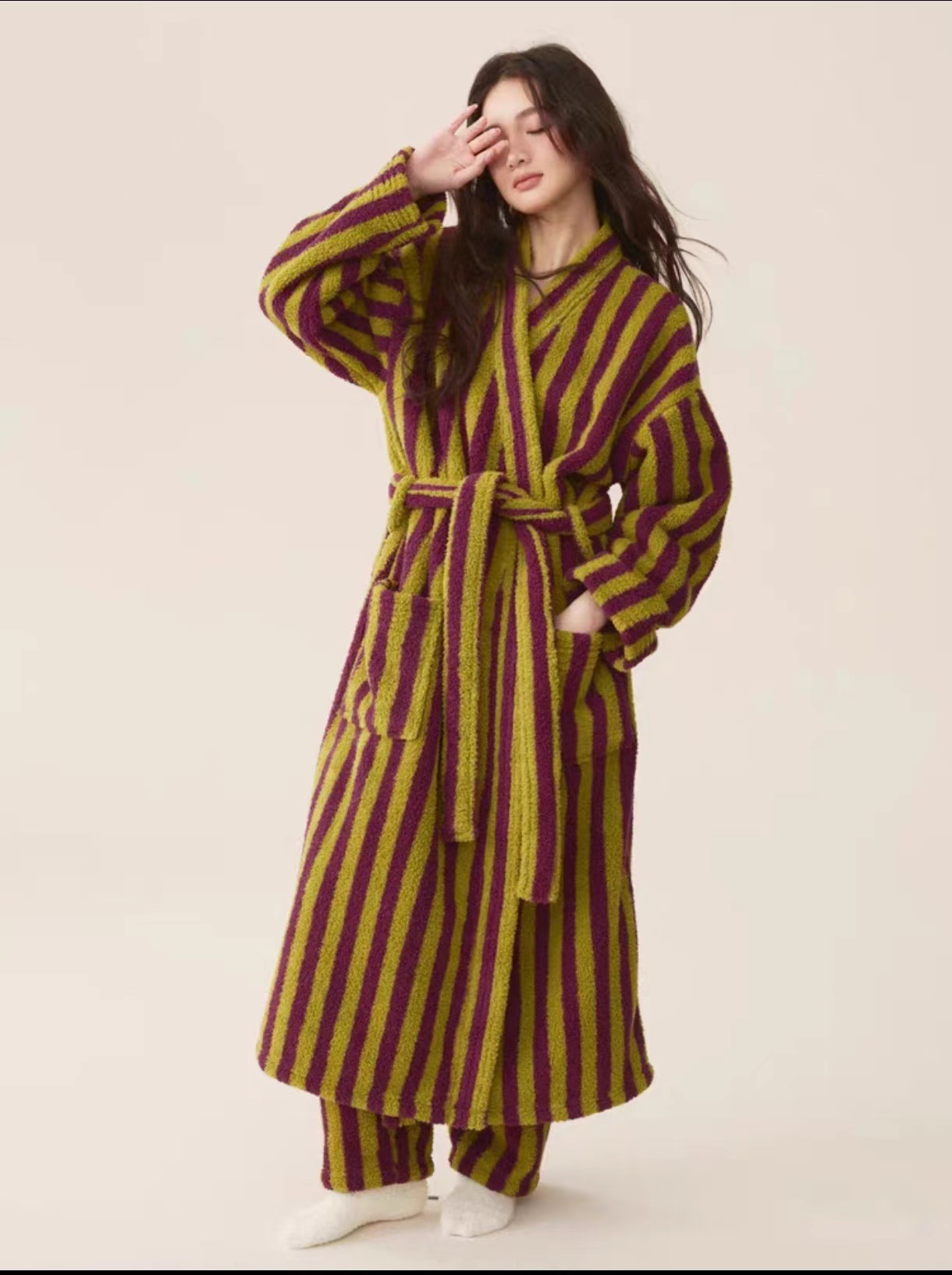 Женский бархатный халат в розово-фиолетовую полоску с рисом