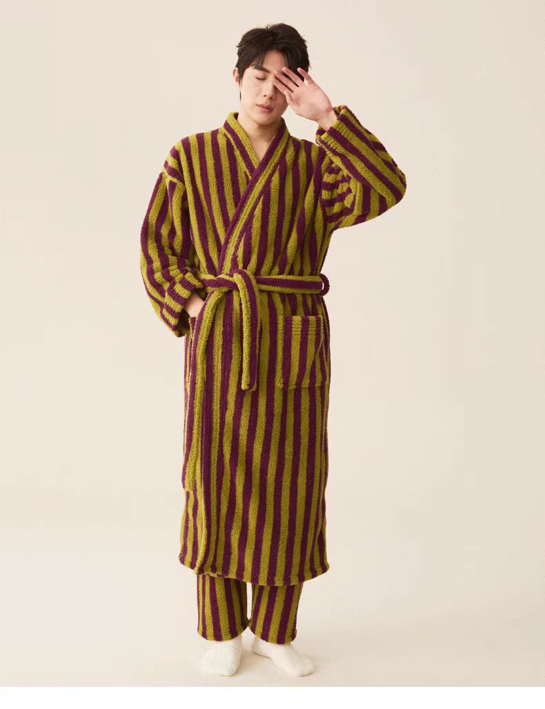 Мужской бархатный халат в розово-фиолетовую полоску с рисом