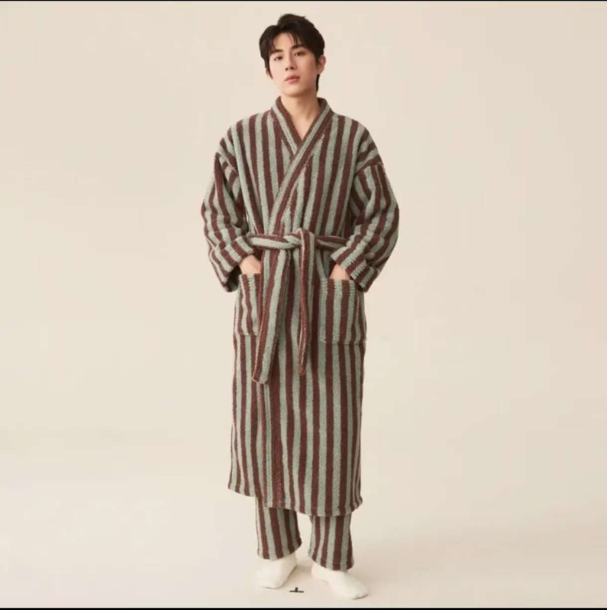 Мужской одинарный халат из рисового бархата в черно-белую полоску