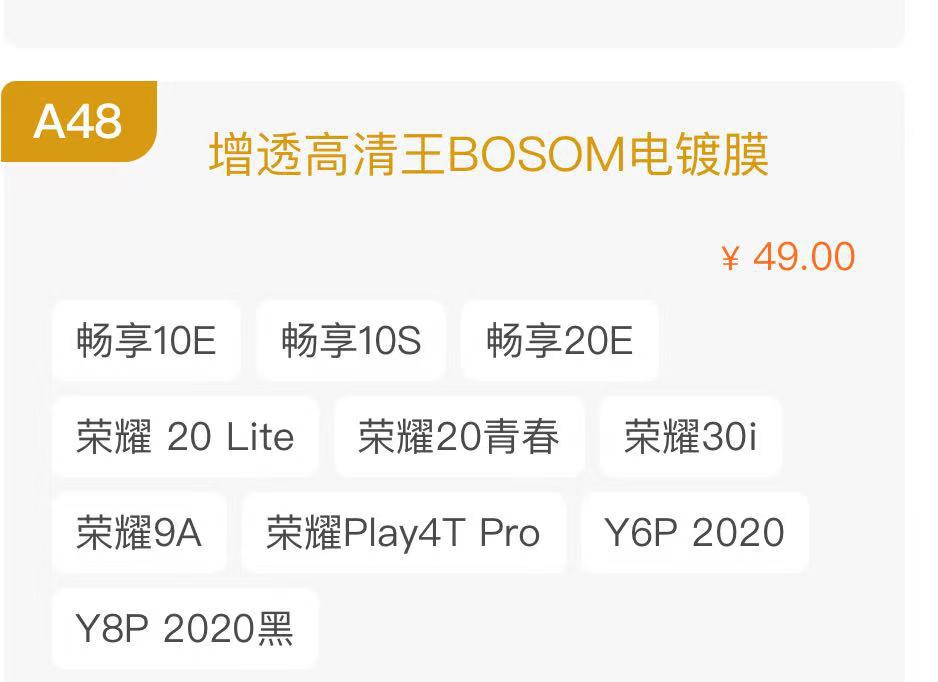 A48` основная модель Honor 9A (гальваническая пленка AR HD BOSOM)