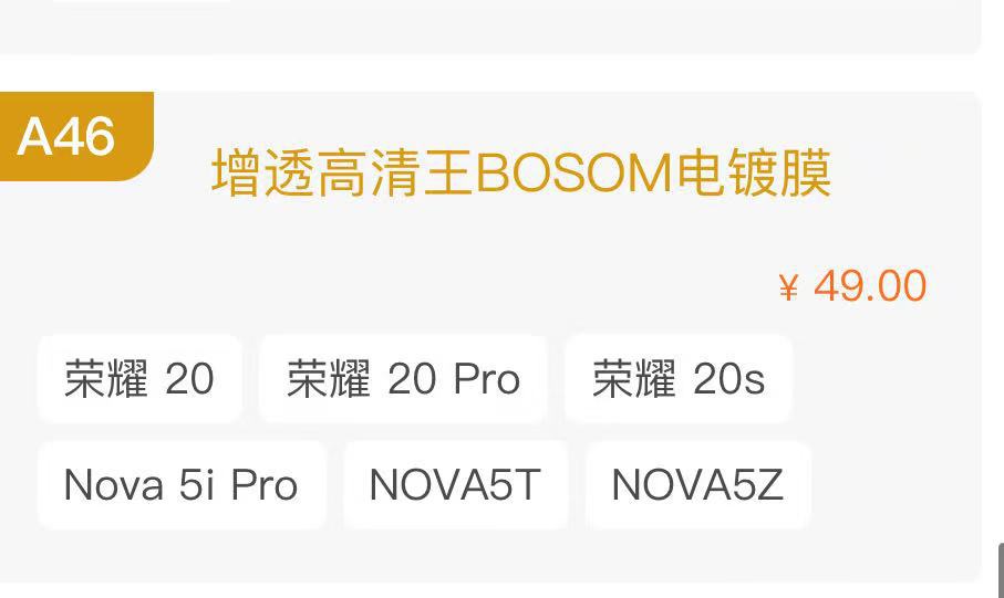 Основная модель A46` Honor 20 (гальваническая пленка AR HD BOSOM)