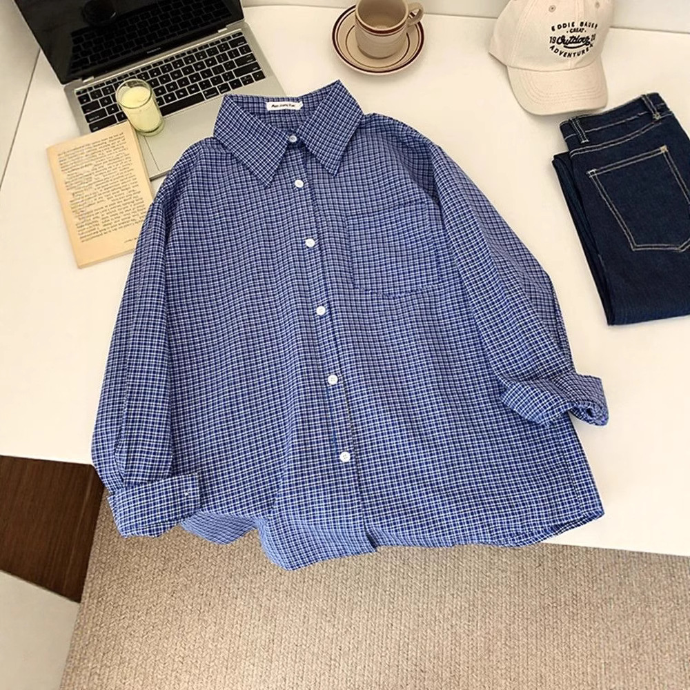 Главная страница > Синяя клетчатая рубашка с длинными рукавами, куртка, топ, женская ранняя осень, ретро, ленивый стиль, свободная повседневная тонкая клетчатая рубашка