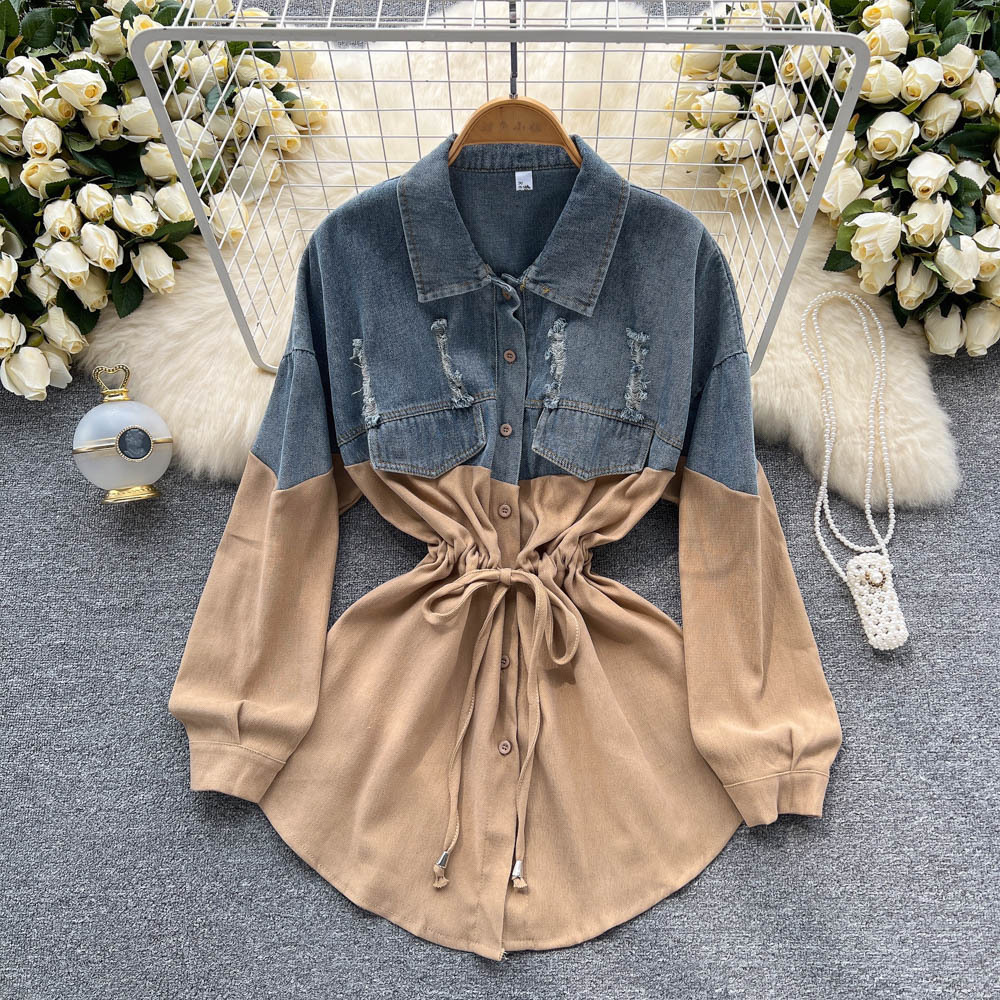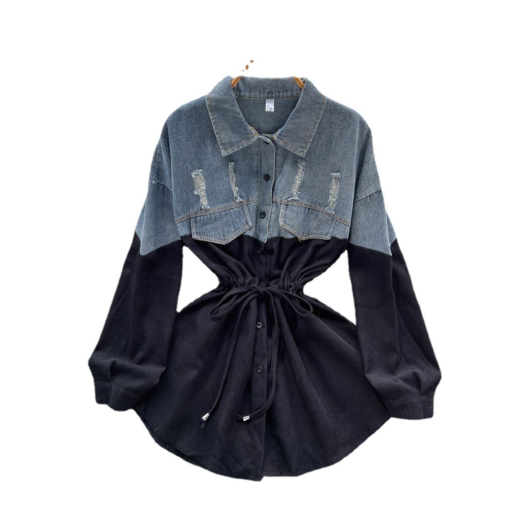 Главная страница > Трансграничная легкая зрелая Летняя женская одежда с длинными рукавами, Высококачественная джинсовая строчка контрастного цвета, обтягивающая Талия, юбка-рубашка с темпераментом