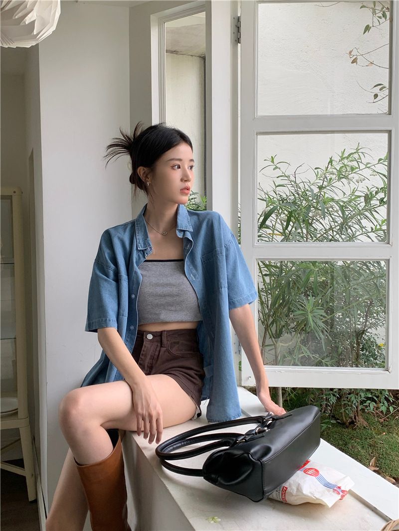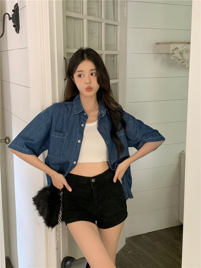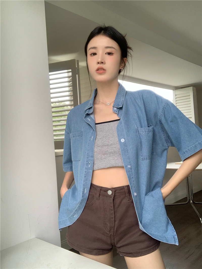 Главная страница > Корейская стильная свободная джинсовая рубашка с коротким рукавом для женщин, весна-лето 2025, повседневный дизайн, тонкая куртка, топ, прямые поставки с фабрики
