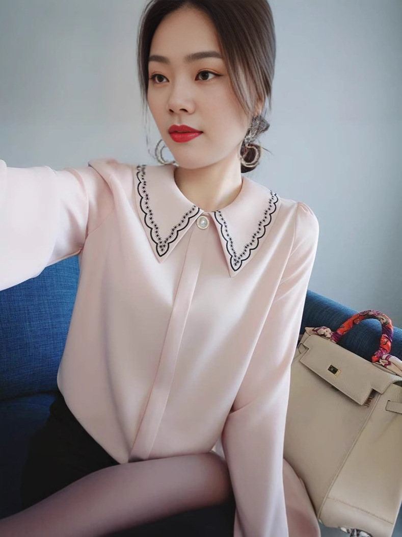 Главная страница > Шифоновая рубашка Женская одежда с длинными рукавами 2025 весна и осень новый вышивка воротник дизайн чувство нишевые дикие топ