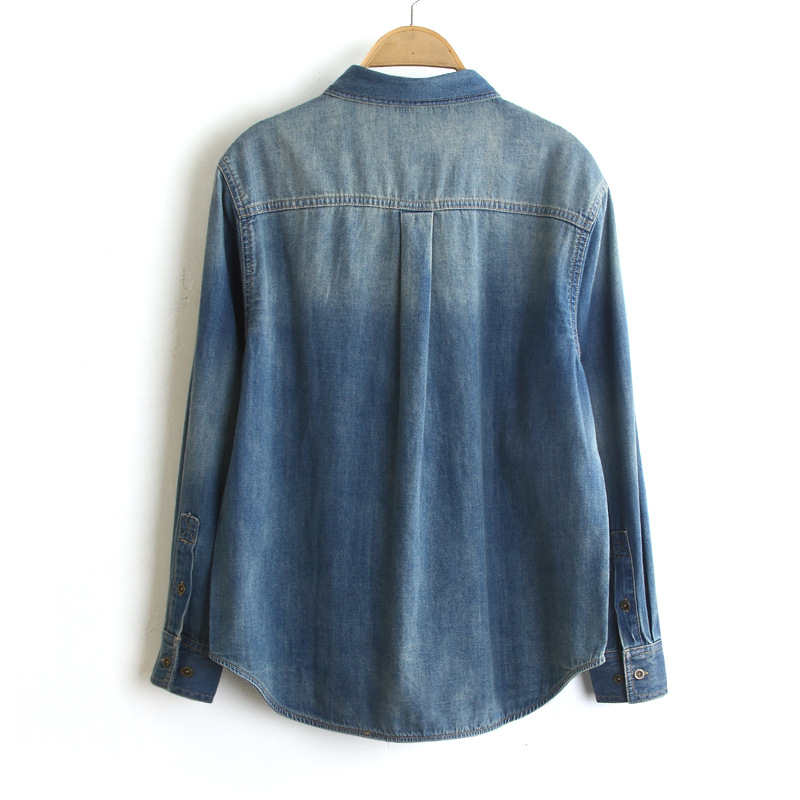 8925 # Новая осенняя коллекция 2025: Женская джинсовая рубашка свободного кроя с эффектом потертости, двухцветная, с длинным рукавом