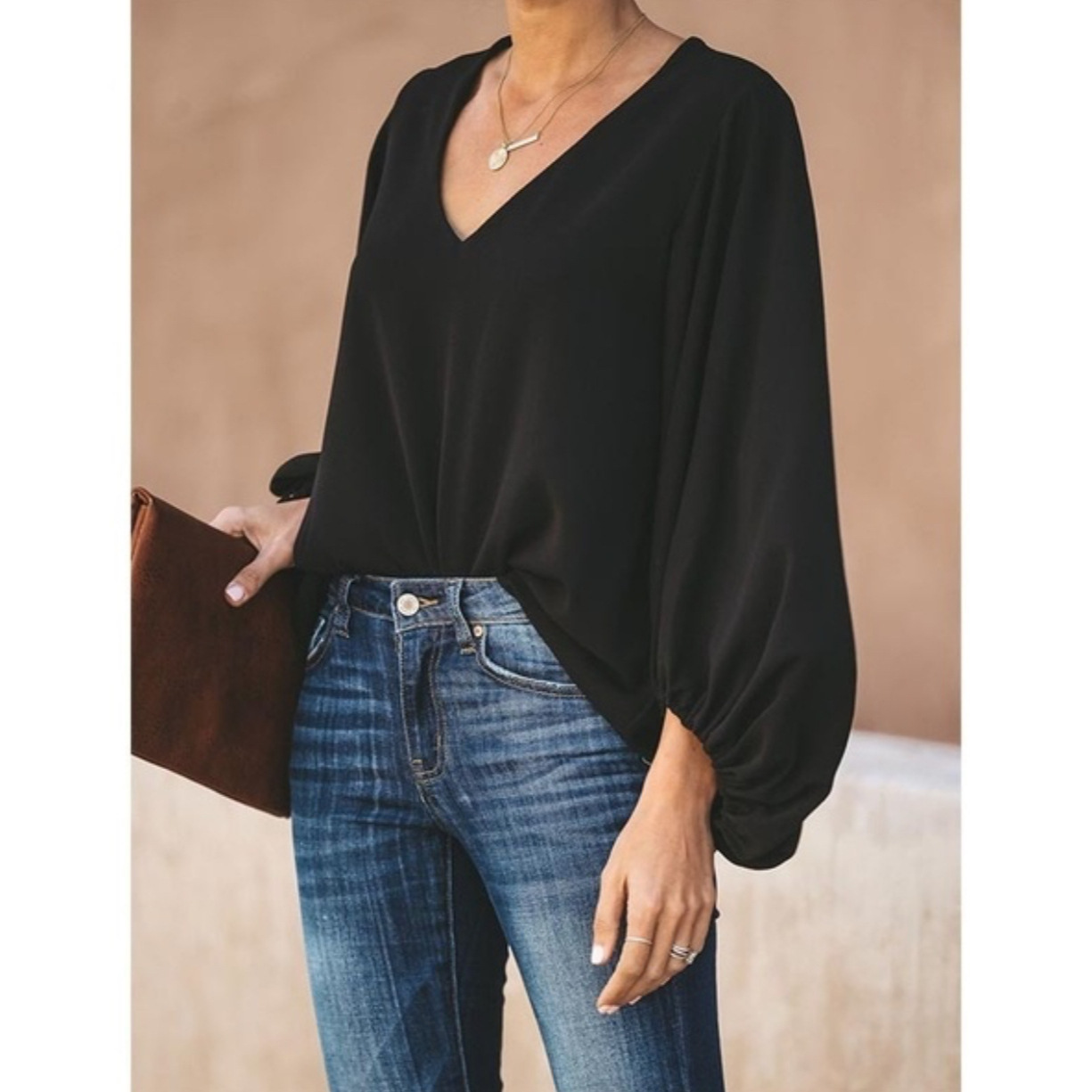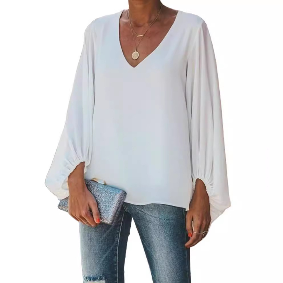 Главная страница > Европейская и американская одежда WISH 2025 летняя трансграничная новая рубашка с v-образным вырезом и рукавами-фонариками, свободный топ большого размера с длинными рукавами для женщин