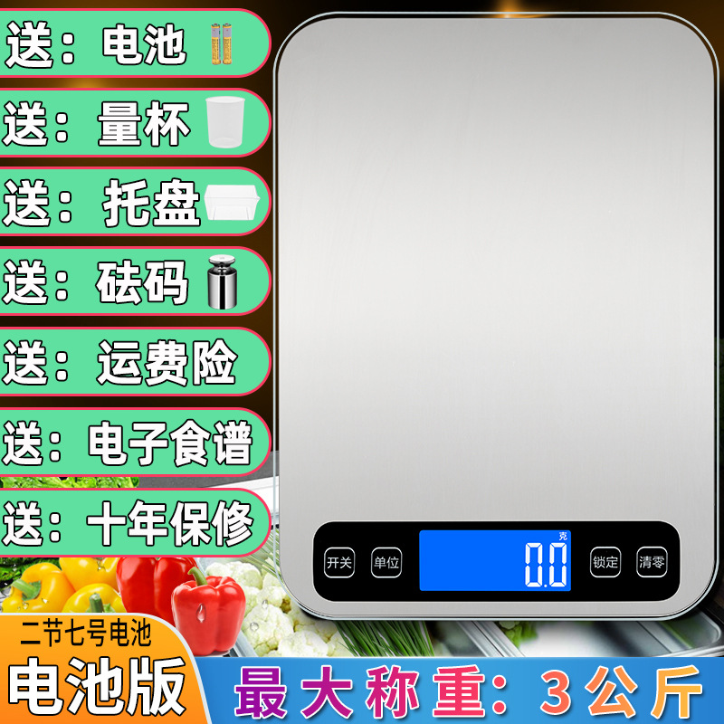 Перезаряжаемая трехразовая версия: 3 кг/0,1 г. В комплект входит: мерный стакан + поднос + гири.