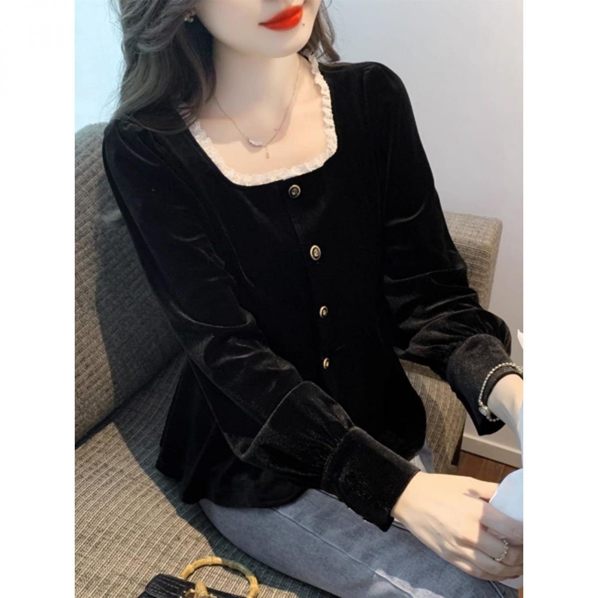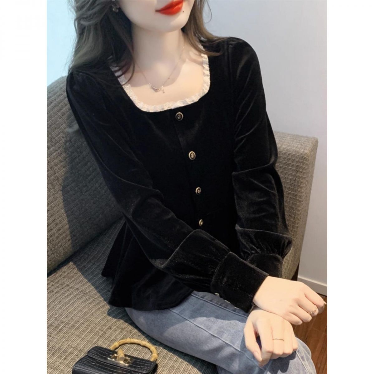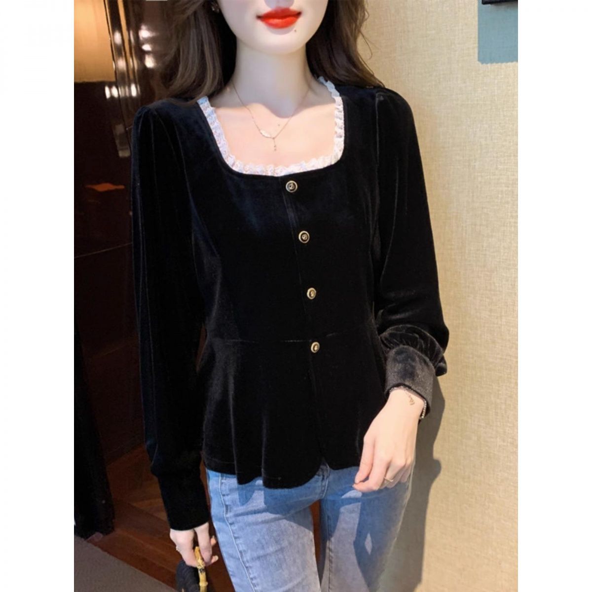 Главная страница > Женские осенние топы больших размеров, французские бархатные рубашки с квадратным вырезом и длинными рукавами, с кружевной отделкой, стройнящие и элегантные.