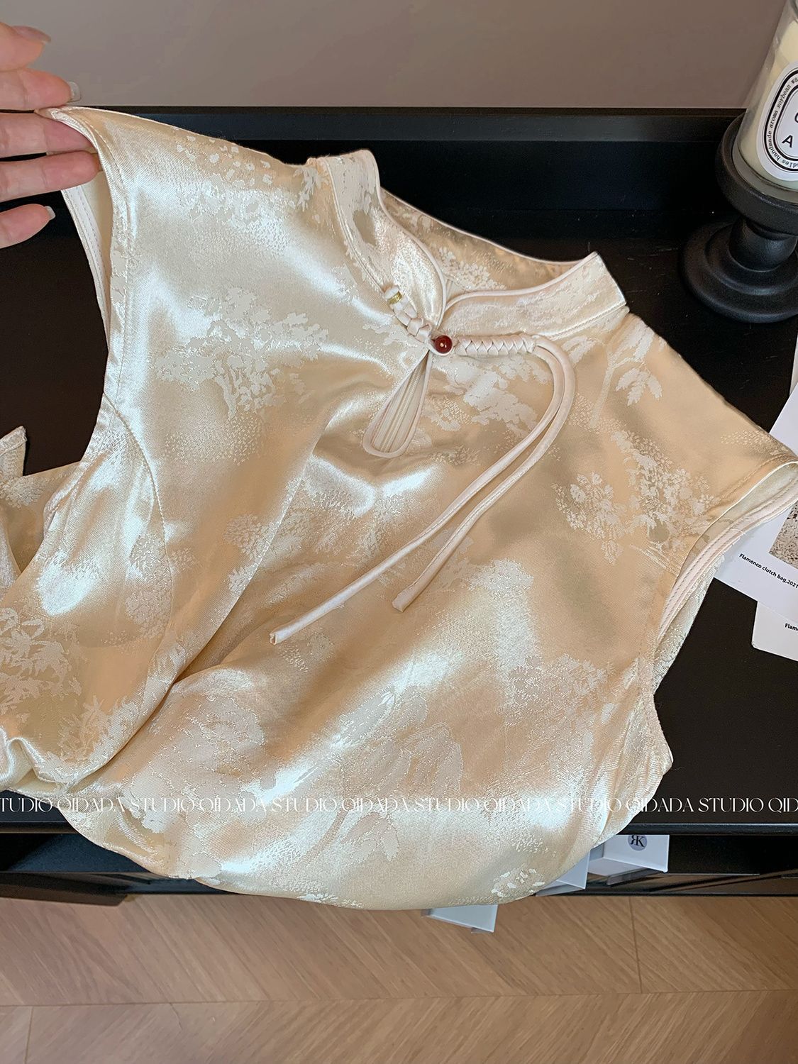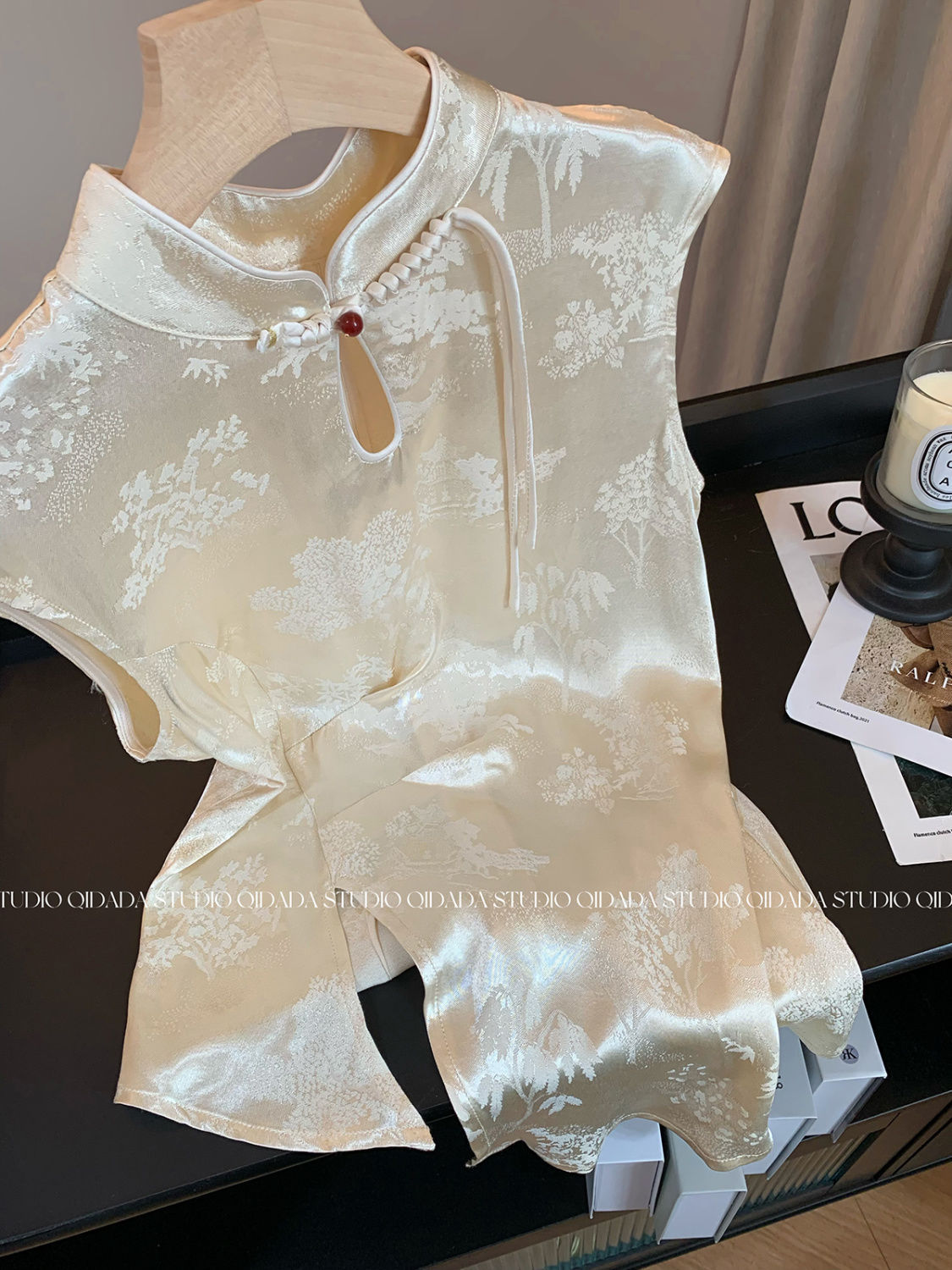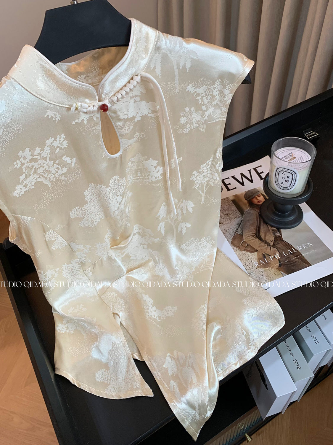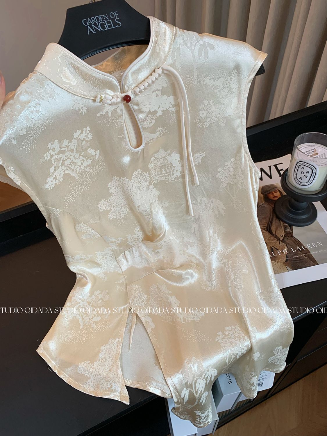 Без рукавов новый китайский легкий национальный топ женский летний короткий тонкий тонкий продвинутый сенсорный пуговицы тонкая атласная цветочная рубашка