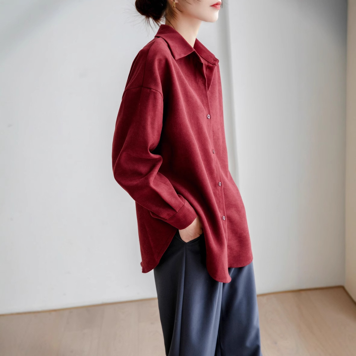 Главная страница > Винтажная рубашка из красного вельвета для женщин, новинка весны и осени 2025 года, свободный крой в стиле BF, утолщенная базовая ткань для многослойного образа.