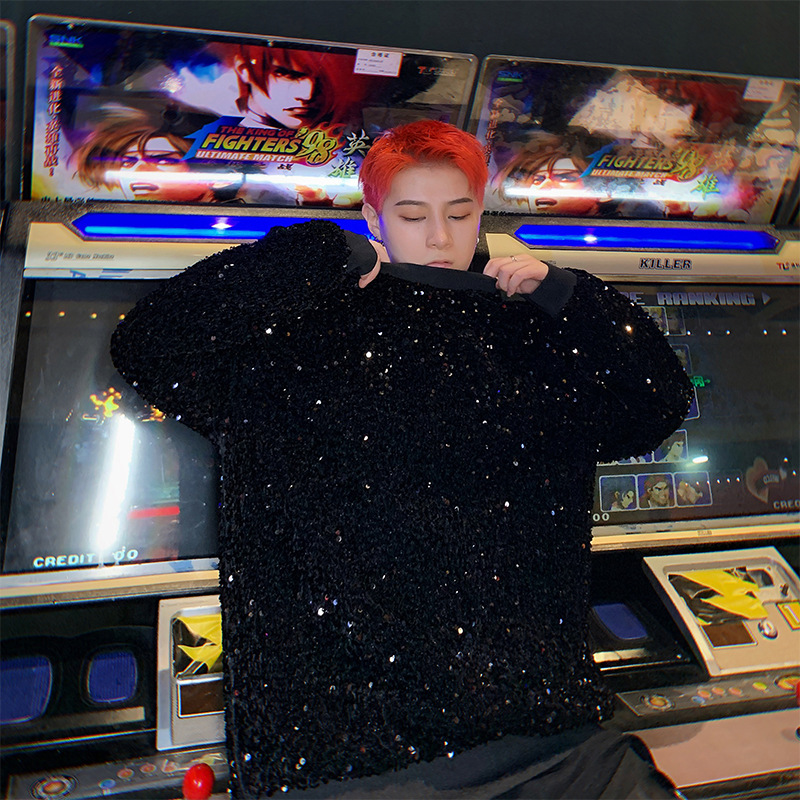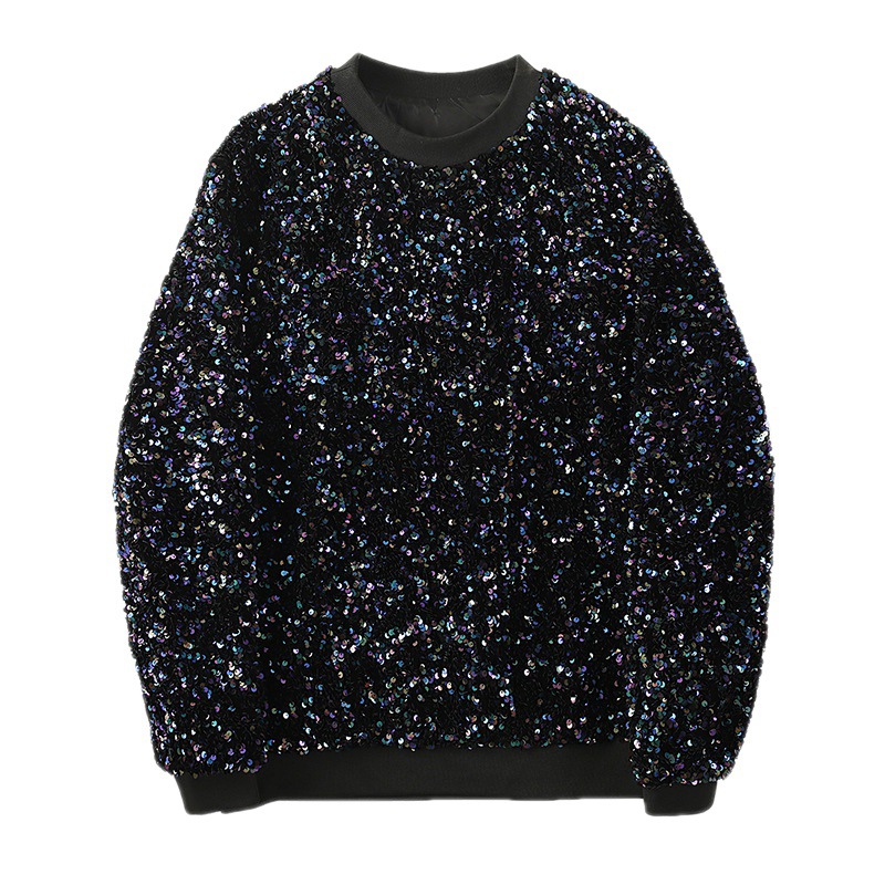 Главная страница > 2022 Хип-хоп ин Флэш-свободный свитер с пайетками Мужская рубашка с длинными рукавами и круглым вырезом Ночной клуб Бар Диско-платье