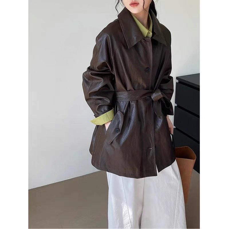 Кожаное пальто цвета карри женский 2025 новый премиум смысл