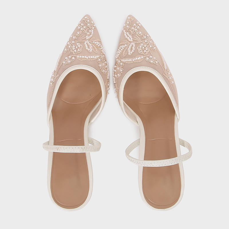 ZA2024 осенне-зимние новые женские туфли белого цвета с неглубоким ремешком сзади и вышитой сеткой на шпильке с открытой пяткой и острым носком туфли-мулы