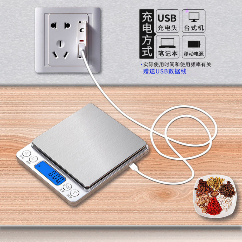Зарядка китайская 500 г/0,01 г поставляется с двумя лотками + USB-кабелем.