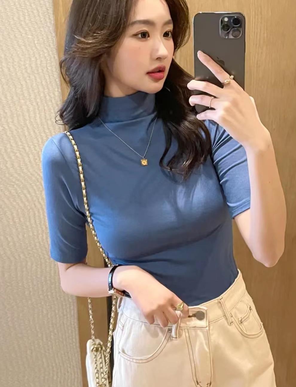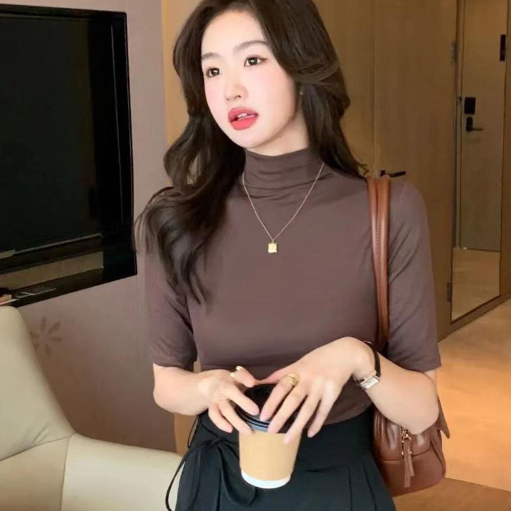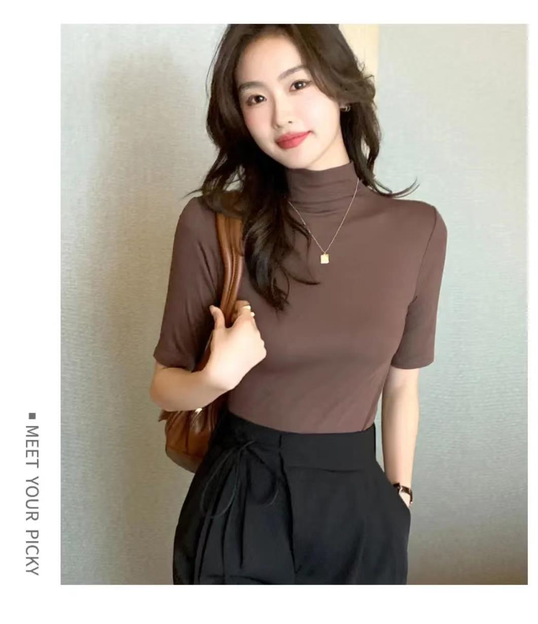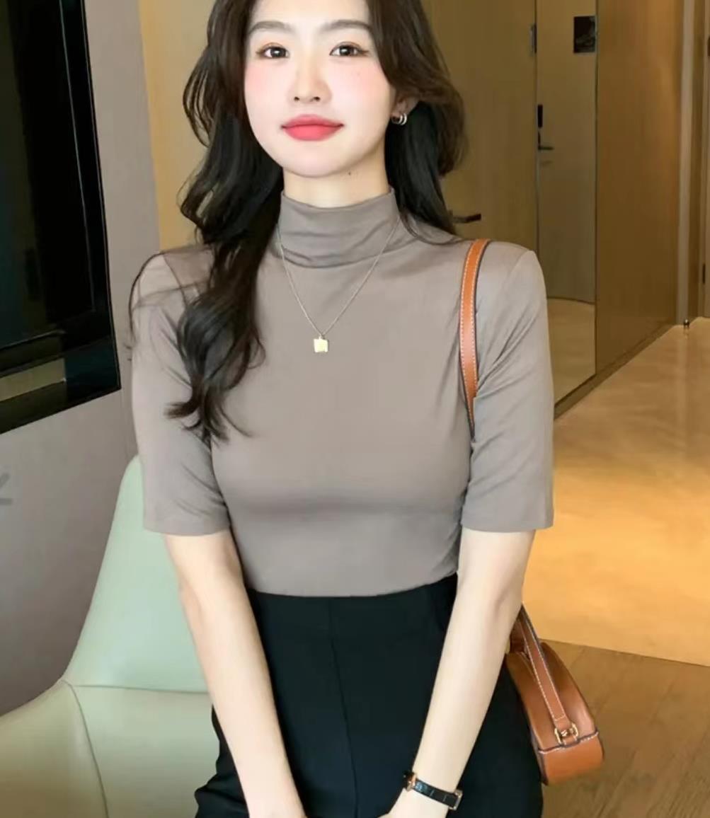 Главная страница > Женская футболка с коротким рукавом и воротником-стойкой, новинка на осень и осень, облегающий однотонный топ в Корейском стиле с воротником-стойкой и рукавами в пять точек
