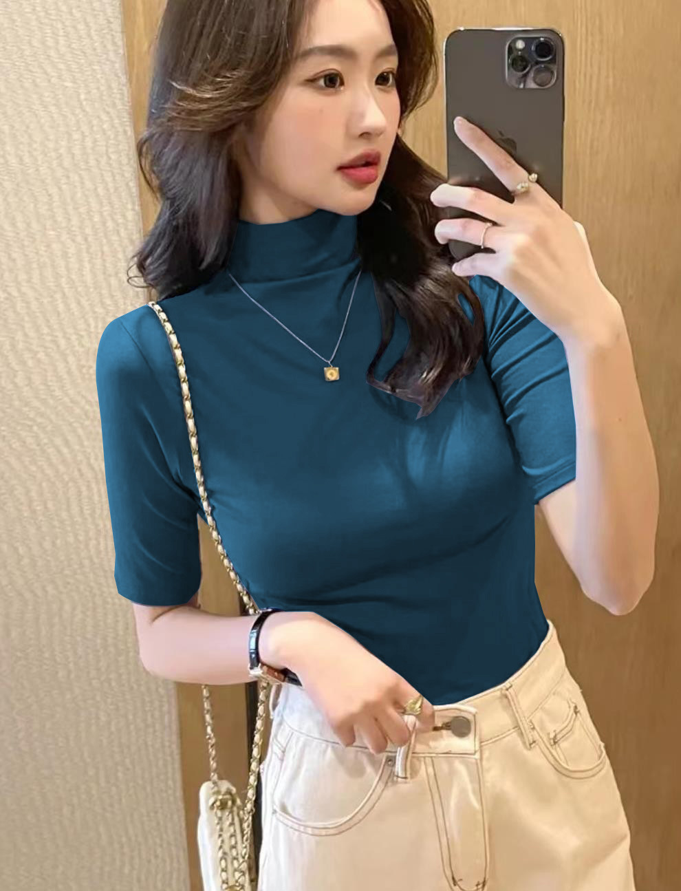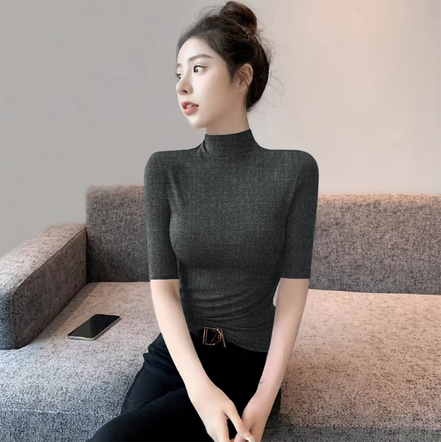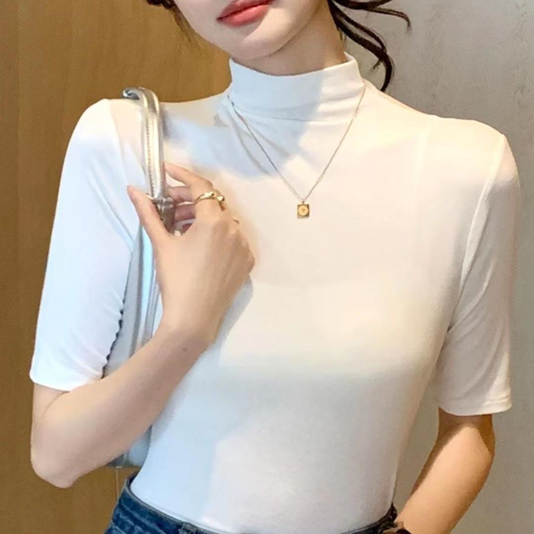 Главная страница > Женская футболка с коротким рукавом и воротником-стойкой, новинка на осень и осень, облегающий однотонный топ в Корейском стиле с воротником-стойкой и рукавами в пять точек