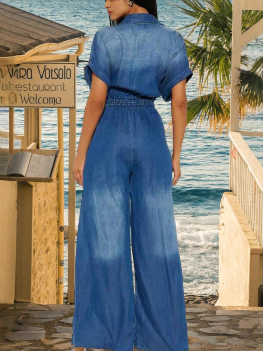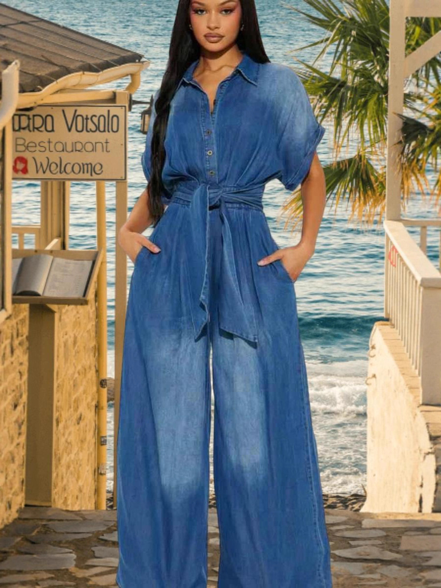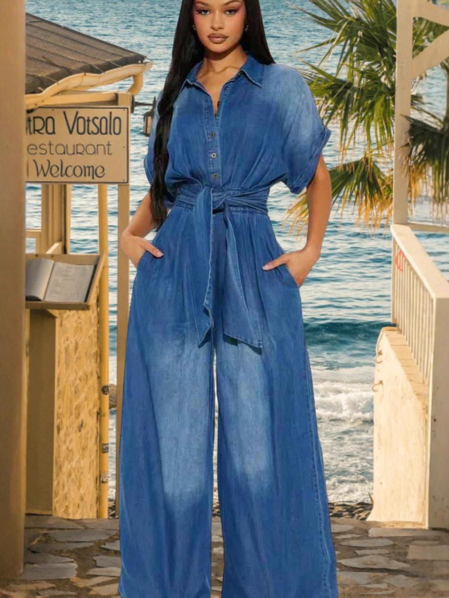 Главная страница > Новинка 2025 года: летний модный джинсовый комбинезон с отложным воротником, приталенный, в пол, с широкими штанинами, для женщин, для трансграничной торговли в Европе и Америке.
