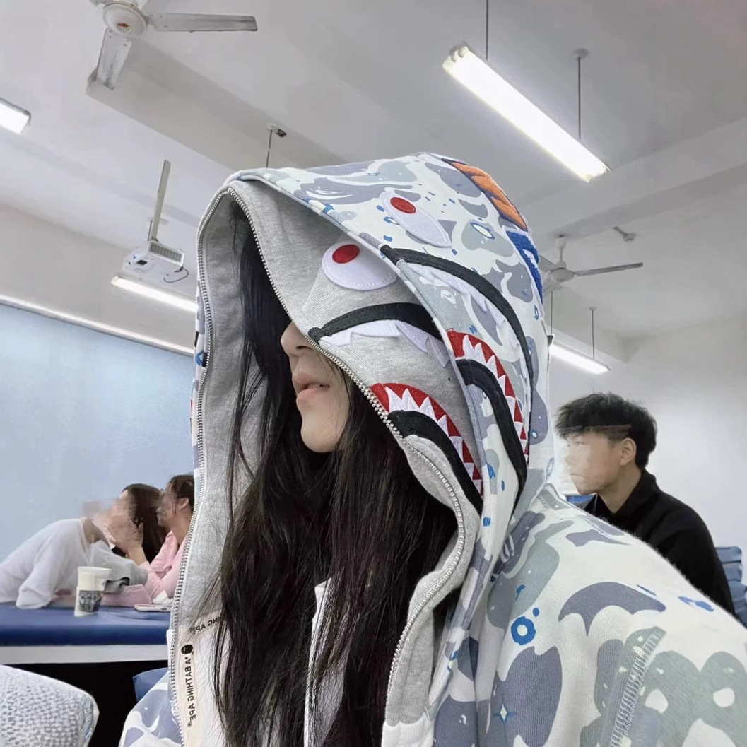 Главная страница > Модная брендовая оригинальная камуфляжная куртка с капюшоном на молнии и головой акулы, повседневная свободная толстовка для пар, мужской кардиган 2025
