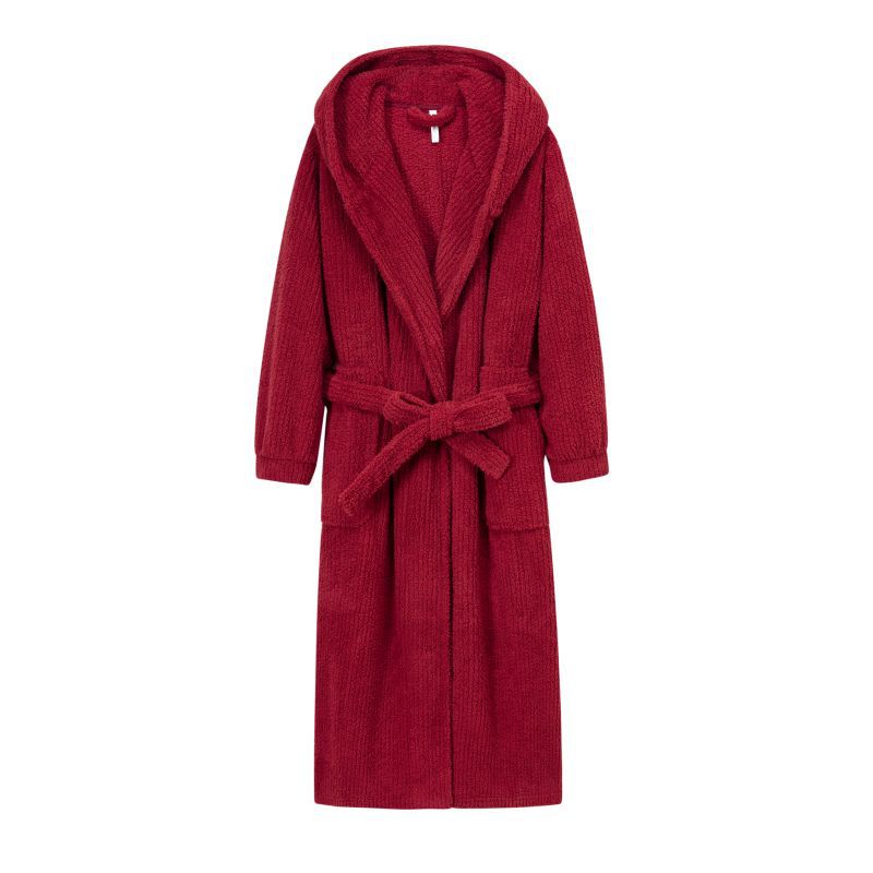 Женский темно-красный полосатый халат с капюшоном + пижама