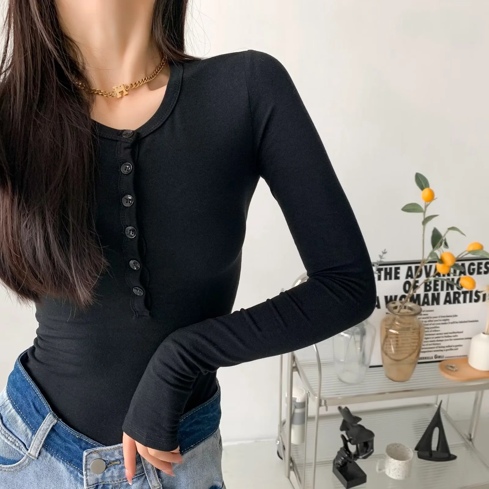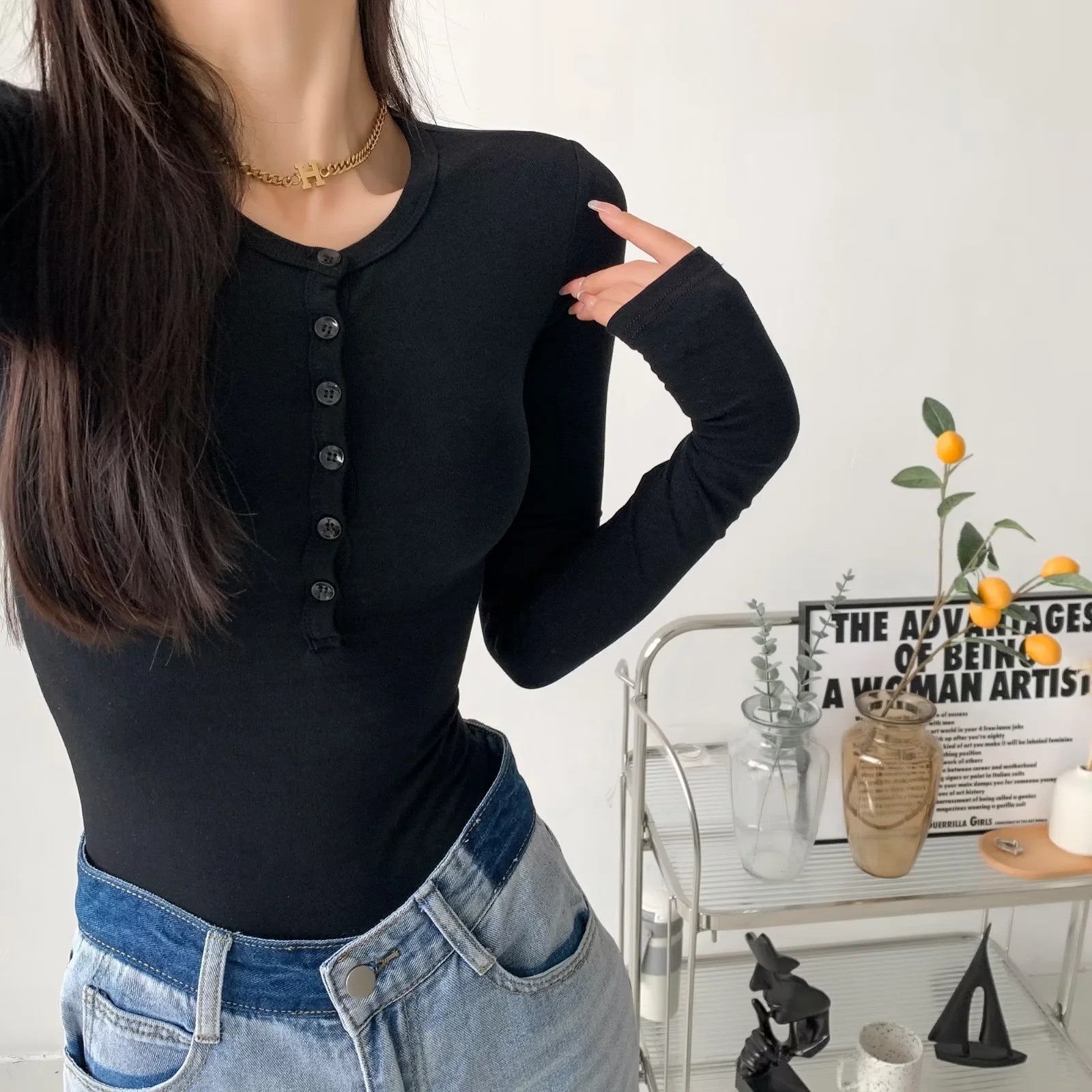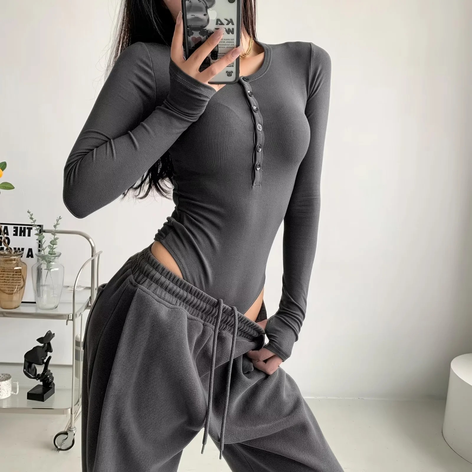Главная страница > Европейский и американский горячий Облегающий комбинезон с рукавами с 6 пуговицами, женский новый цельный топ с круглым вырезом и дном 2023 года