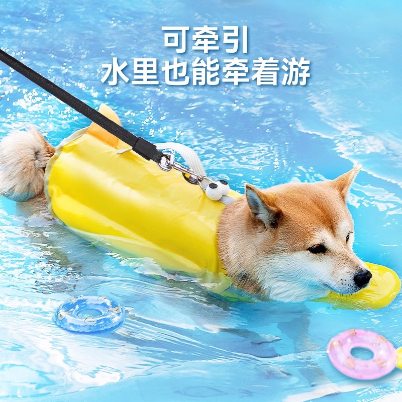 Летняя собака плавает милые большие глаза, милый спасательный жилет