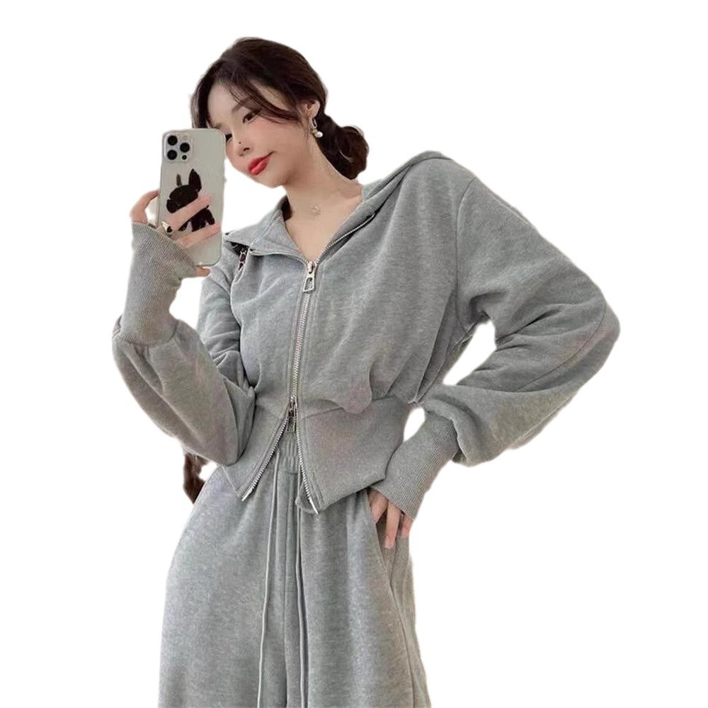 Спортивный костюм для женщин 2025: осенний новый комплект в корейском стиле, свободный, модный, повседневный свитшот на молнии + брюки с широкими штанинами, комплект из двух предметов