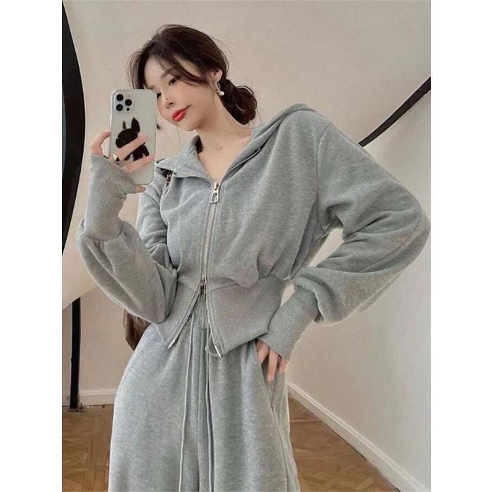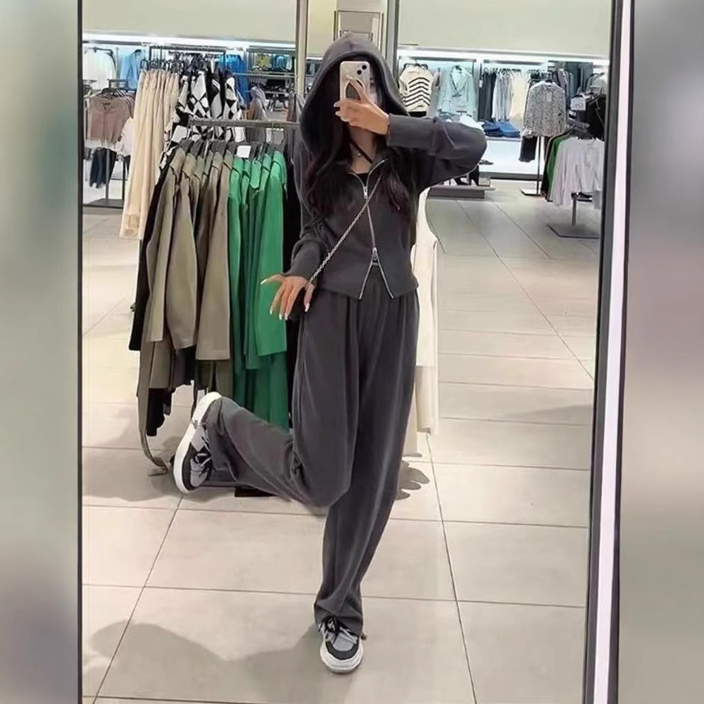 Главная страница > Спортивный костюм для женщин 2025: осенний новый комплект в корейском стиле, свободный, модный, повседневный свитшот на молнии + брюки с широкими штанинами, комплект из двух предметов