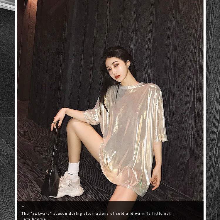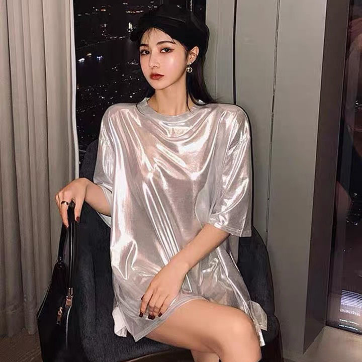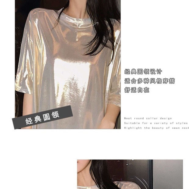 Большая европейская версия блестящих футболок женская весна 2025 новая модная модель средней и длинной свободной bf с короткими рукавами студенческий хип-хоп