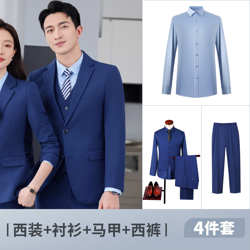 Мужской костюм королевского синего цвета + голубая рубашка + жилет + брюки