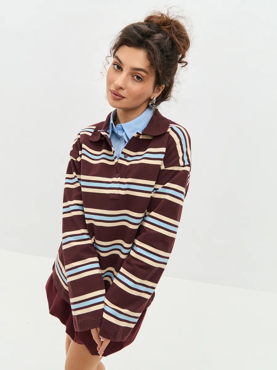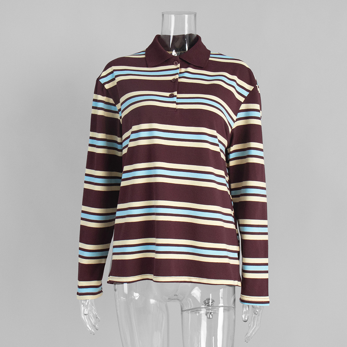 Главная страница > Женская полосатая футболка с длинными рукавами, европейская и американская весенне-летняя новая свободная футболка с воротником-поло, модная футболка в стиле ретро