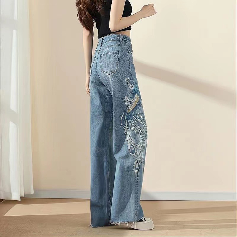 Главная страница > Широкие женские джинсы с высокой талией, весна-лето 2025, с вышивкой «феникс», прямые, свободные, модные, стройнящие, расклешенные, драпированные