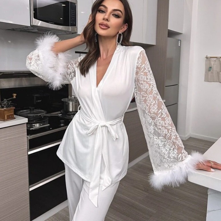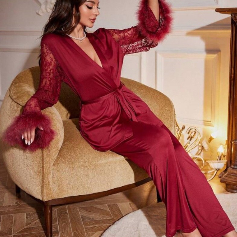 Главная страница > 2025 Европейские и американские Amazon трансграничные новые пижамы с кружевным V-образным вырезом и комплектом ночной сорочки из молочного шелка