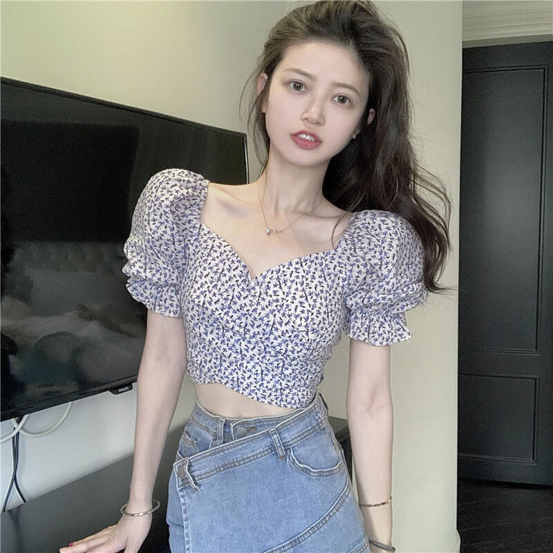 Главная страница > Женская рубашка с короткими рукавами и цветочным принтом, ниша с дизайном, уменьшающим возраст, новинка 2025 года, квадратный воротник, пышные рукава, открытая талия, короткий топ, лето