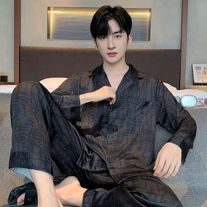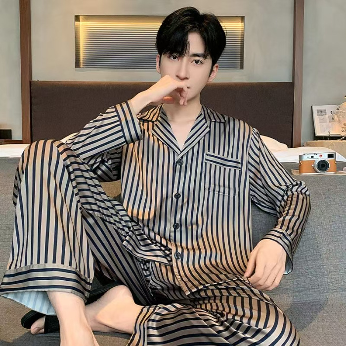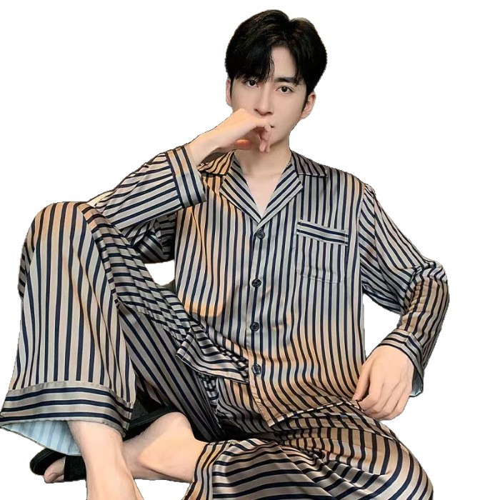 Главная страница > Весенне-осенние мужские пижамы, брюки из ледяного шелка, летний тонкий комплект домашней одежды из высококачественного искусственного шелка для подростков с длинными рукавами.