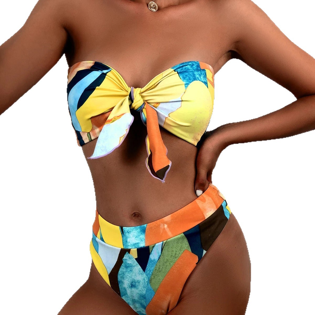 2022 Новое поступление, сексуальные купальники бикини без бретелек с принтом тай-дай, Женский приталенный комплект из двух частей с разрезом