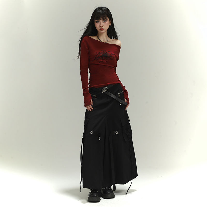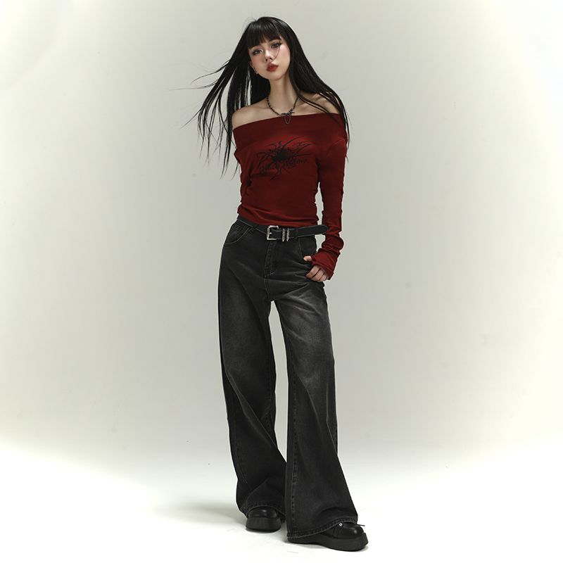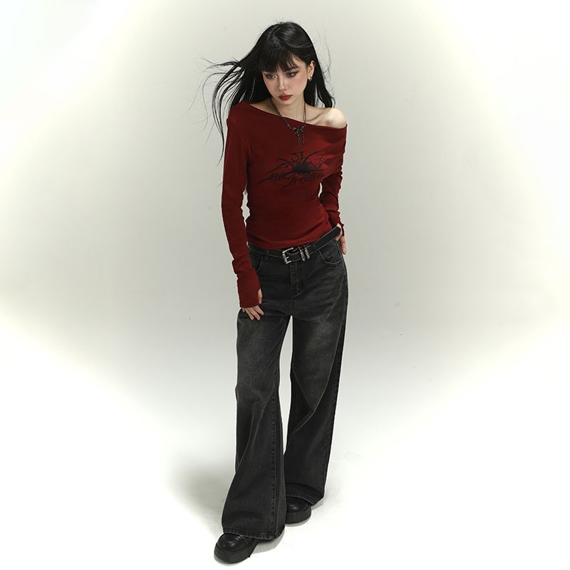 Осенняя и зимняя новая горячая девушка тонкая и тонкая с шикарным и сладким пряным топом на плече для женщин с длинными рукавами футболка с длинными рукавами