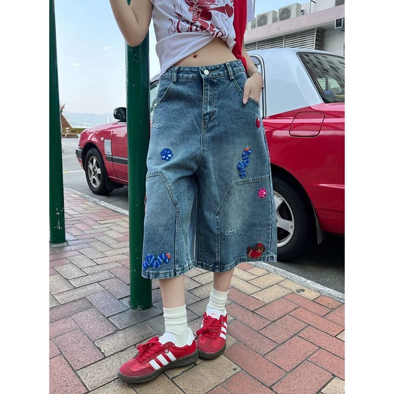 Главная страница > Укороченные женские брюки из американского денима с вышивкой в стиле пэчворк, летний дизайн, нишевые свободные широкие брюки средней длины.