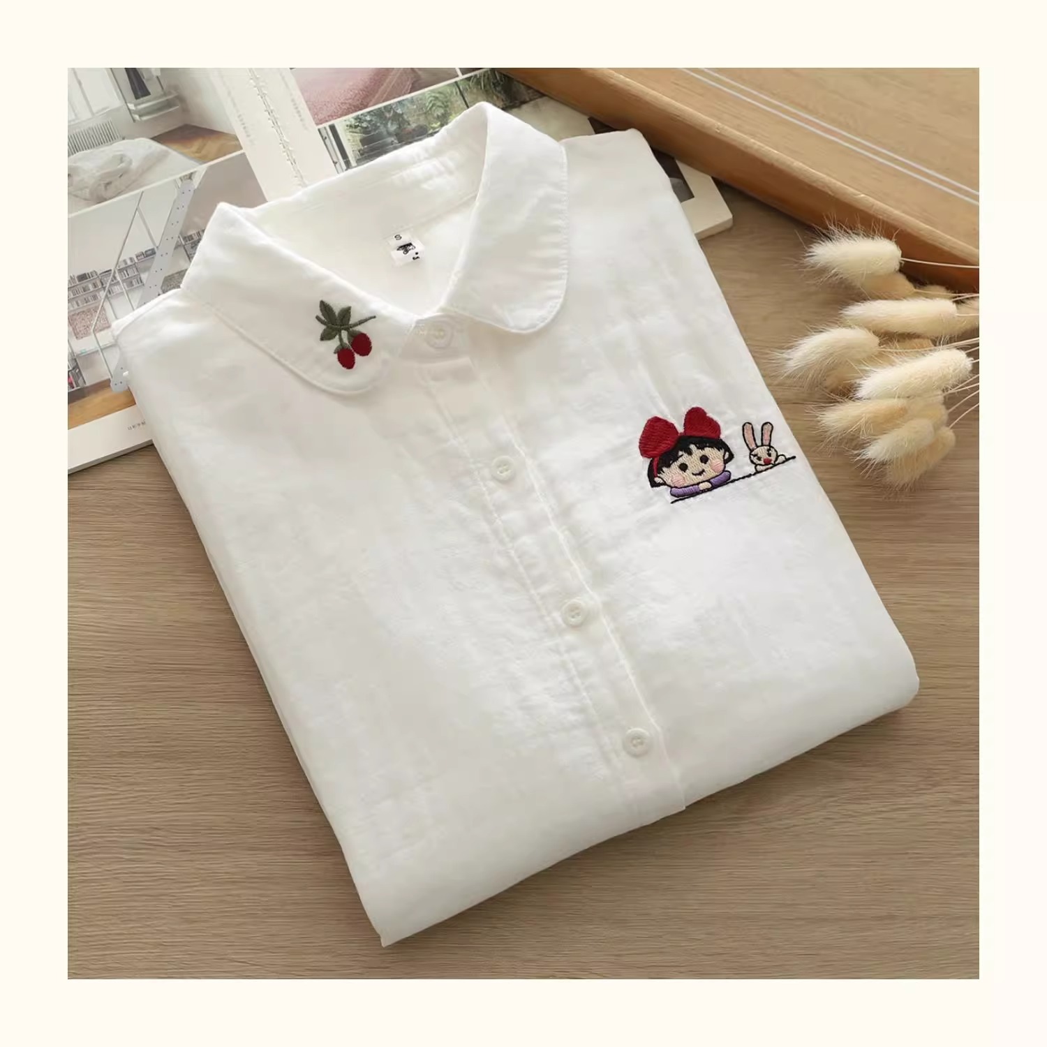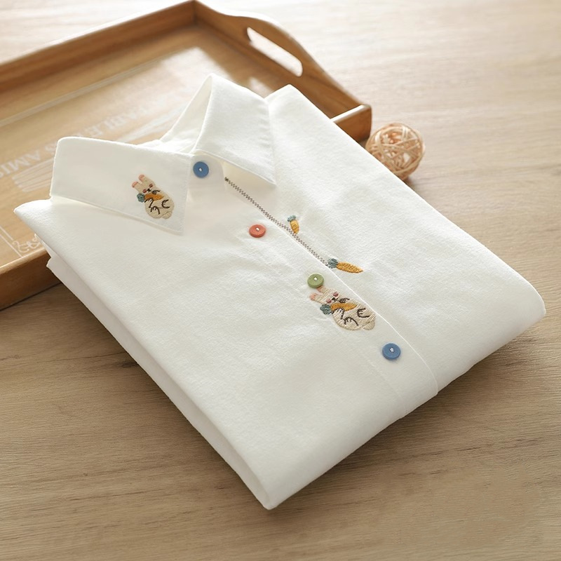 Хлопковая рубашка с вышивкой кролика и редиски, новый весенне-осенний стиль, лёгкая и свежая, полностью хлопковая, белая, с длинным рукавом, для женщин, подходит для студенток.