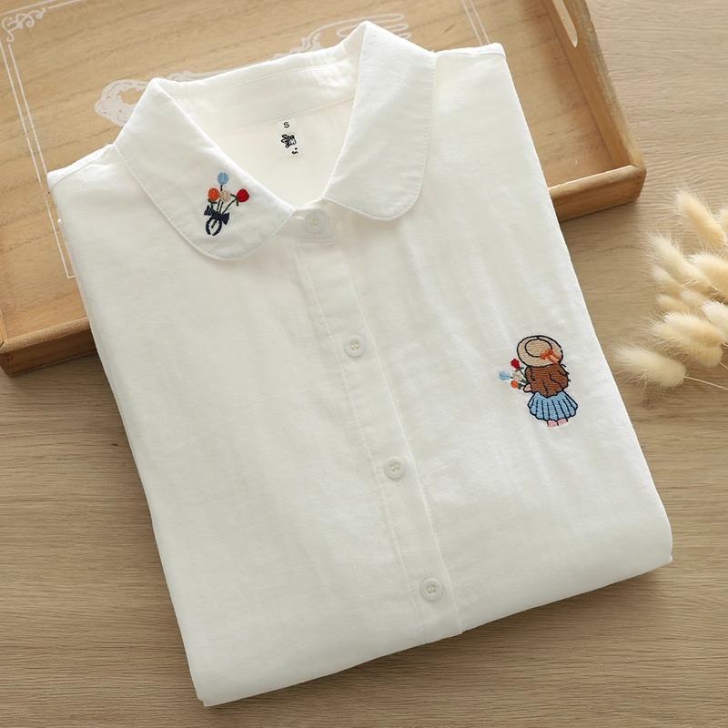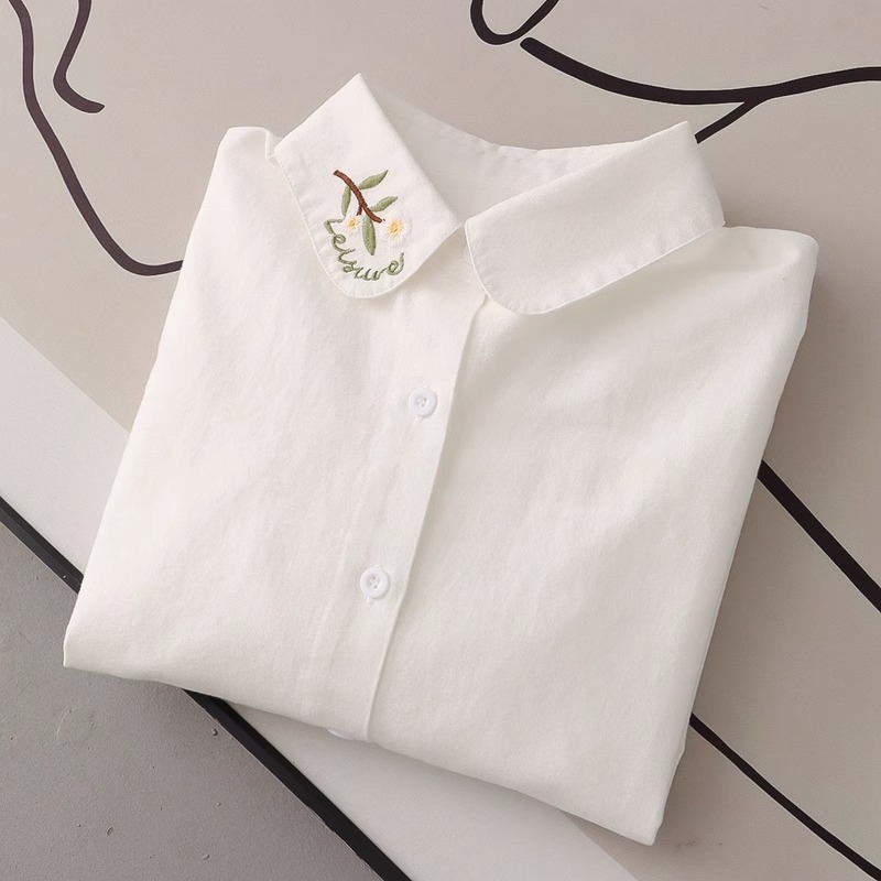 Главная страница > Хлопковая рубашка с вышивкой кролика и редиски, новый весенне-осенний стиль, лёгкая и свежая, полностью хлопковая, белая, с длинным рукавом, для женщин, подходит для студенток.