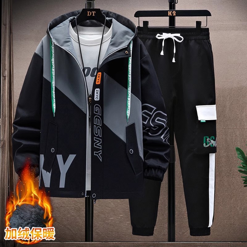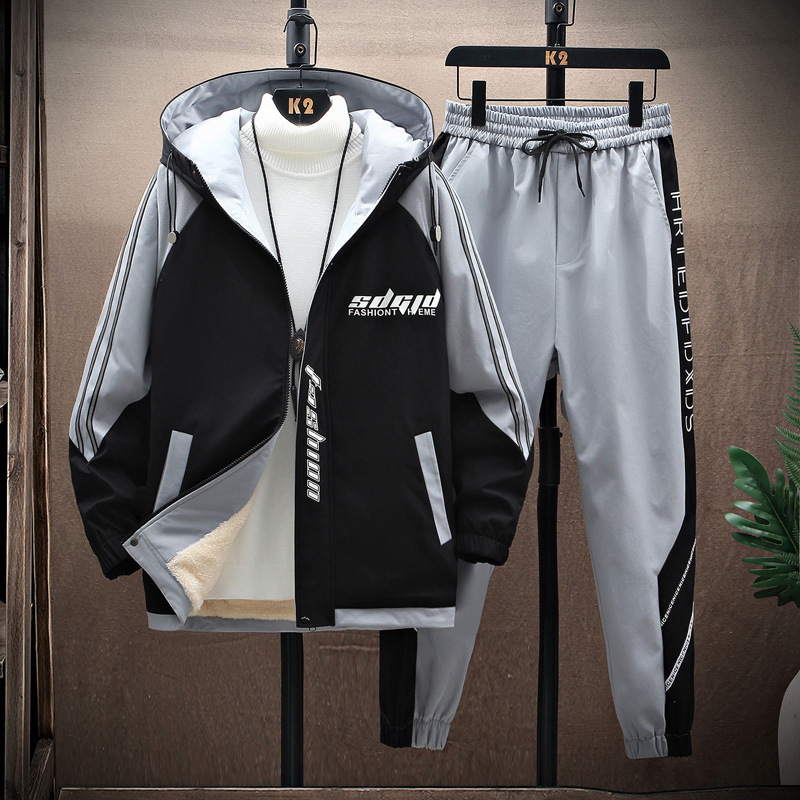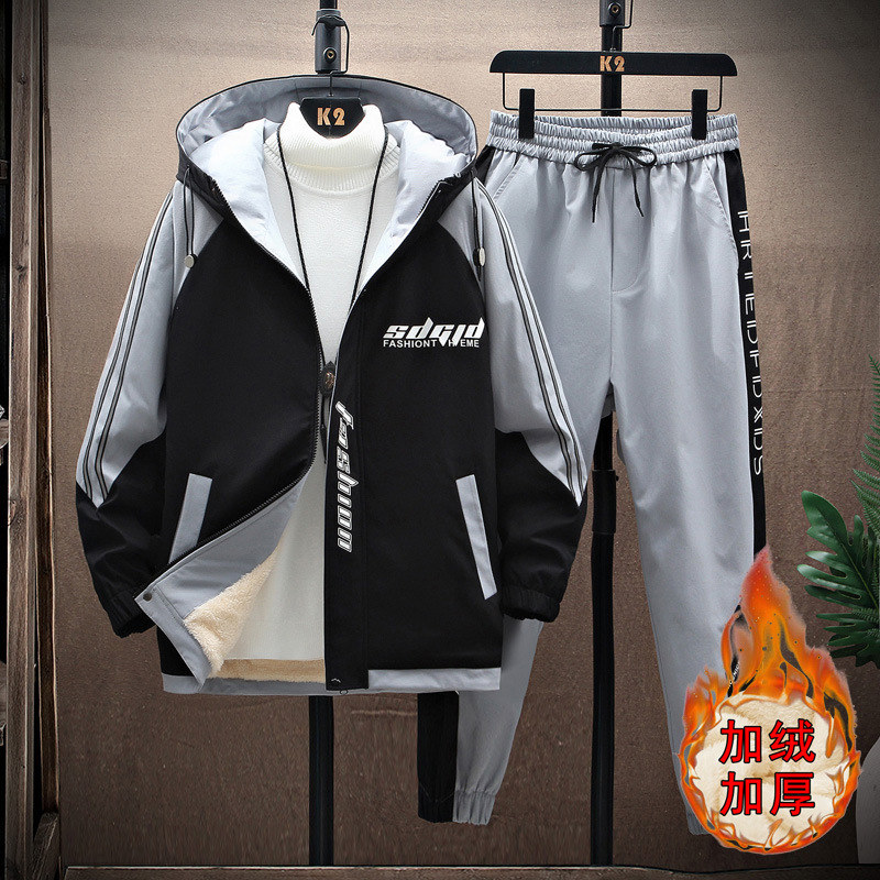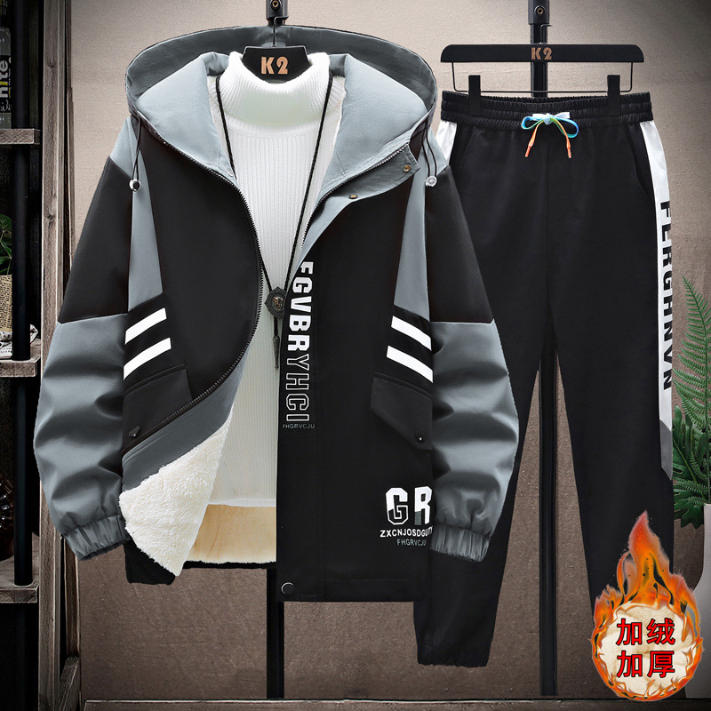 TZ8801 Бархатный утолщенный черный серый [Комплект] Куртка + брюки