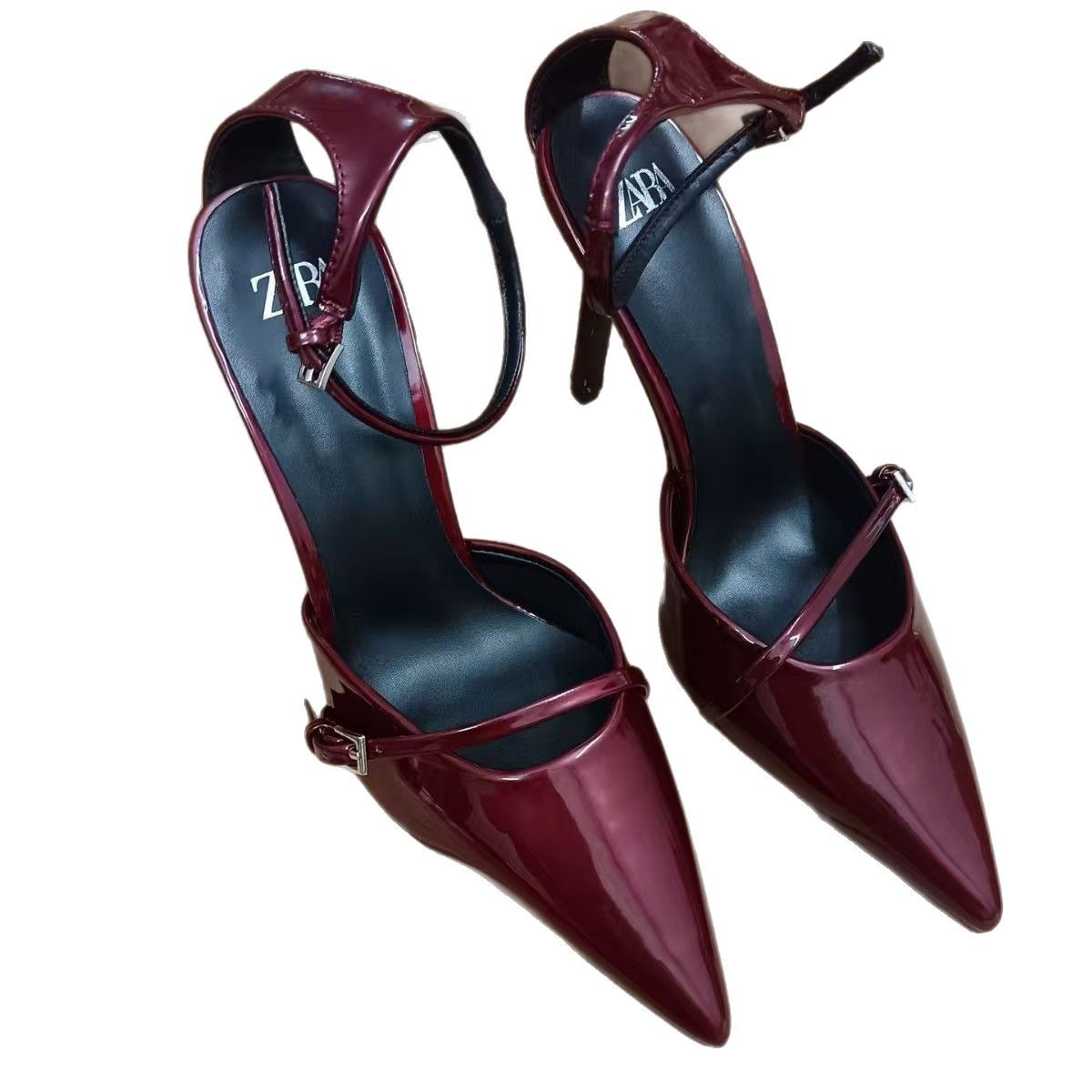 2024 новые осенние женские туфли в винно-красной лакированной коже с заостренной и неглубоким ртом на высоких каблуках