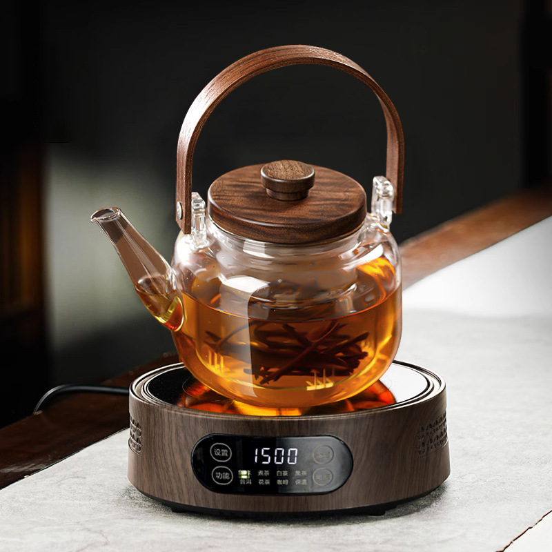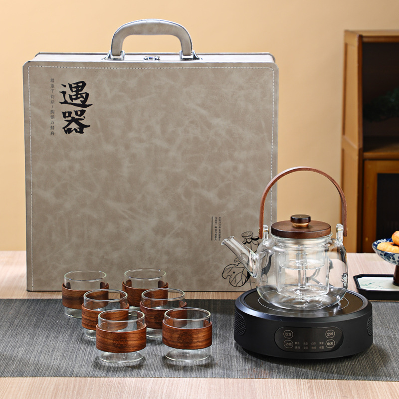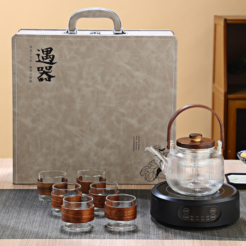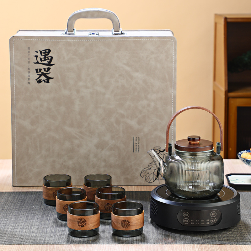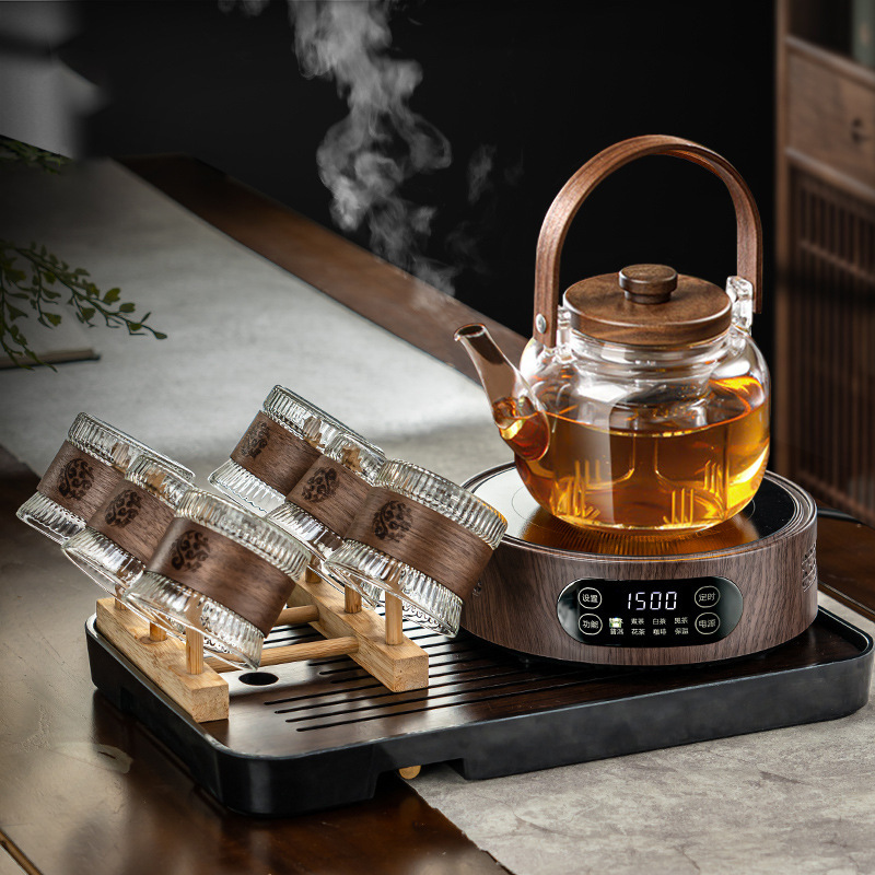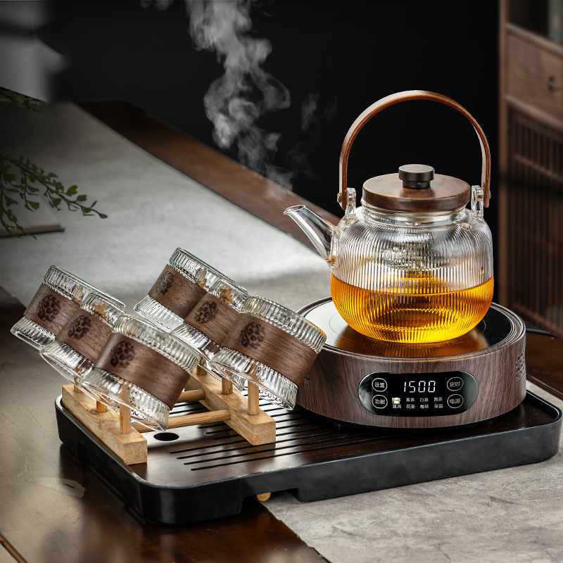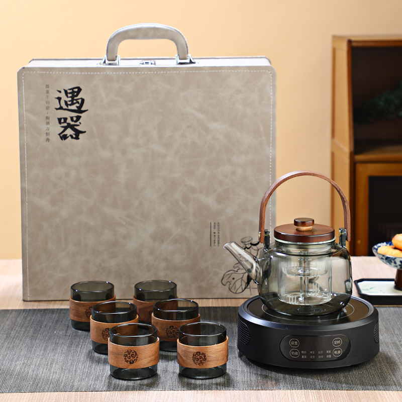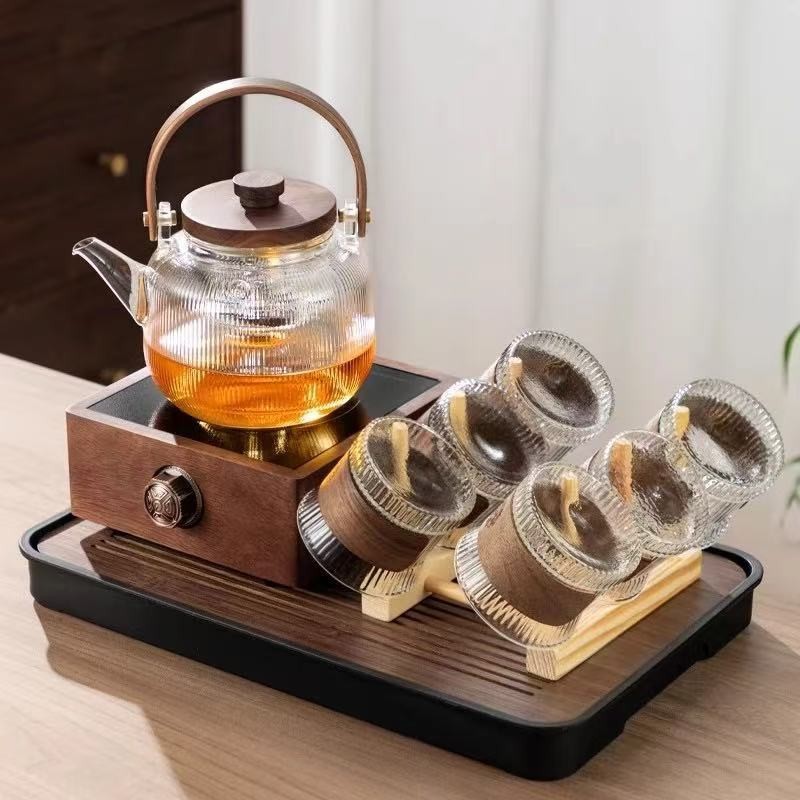 Плоский горшок + 6 поясных чашек + подстаканник + электрическая керамическая плита с древесной текстурой T12 + поднос для чая