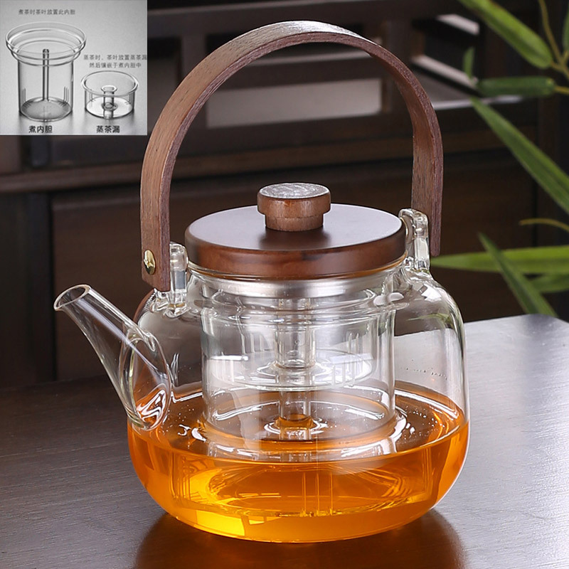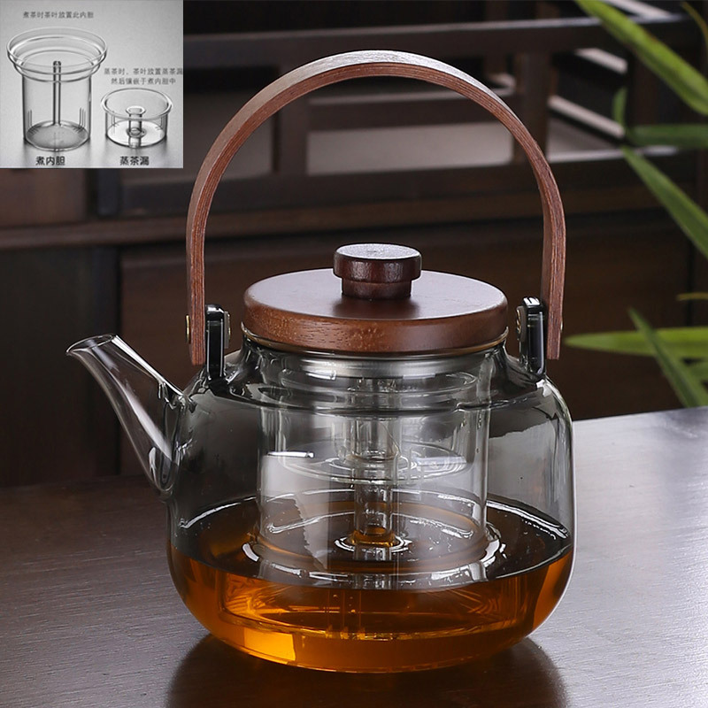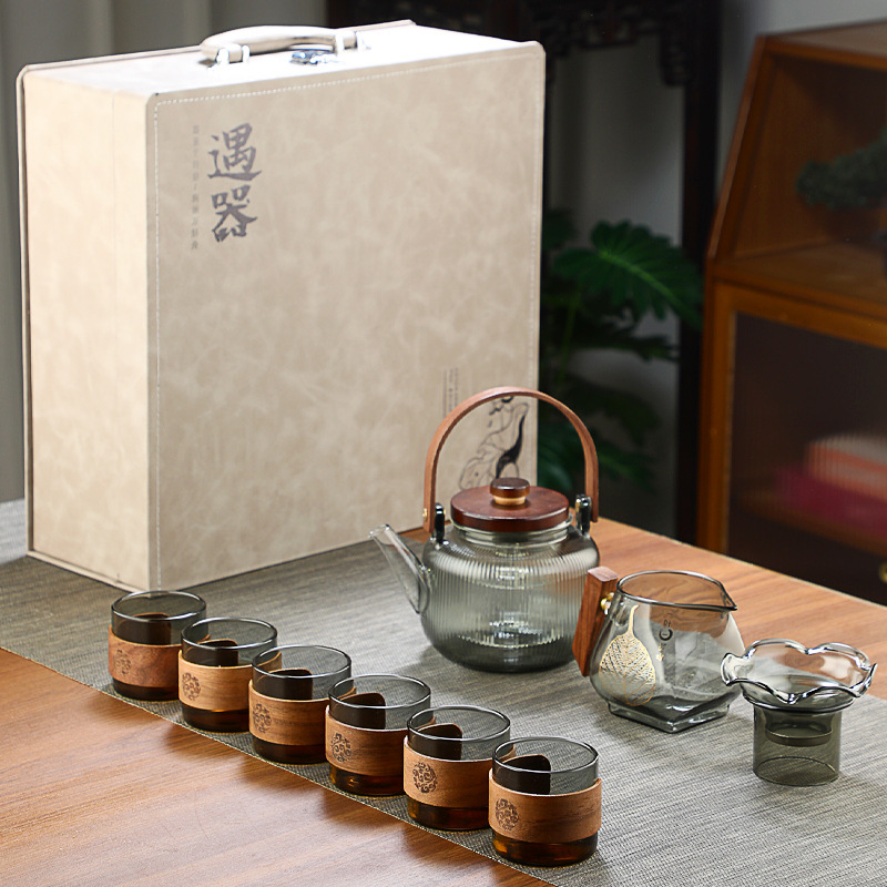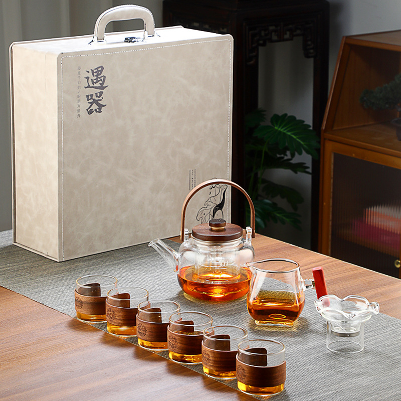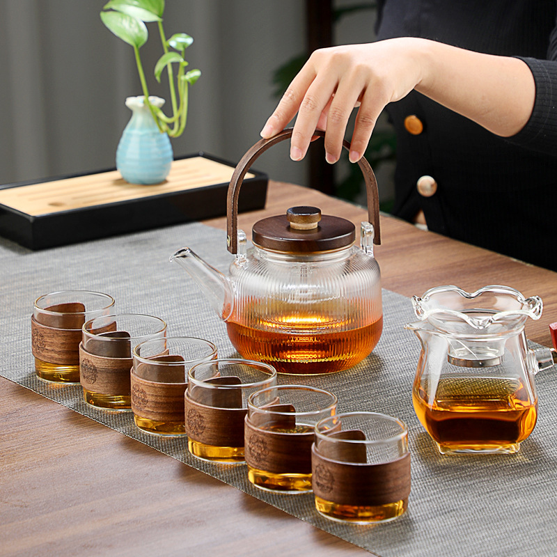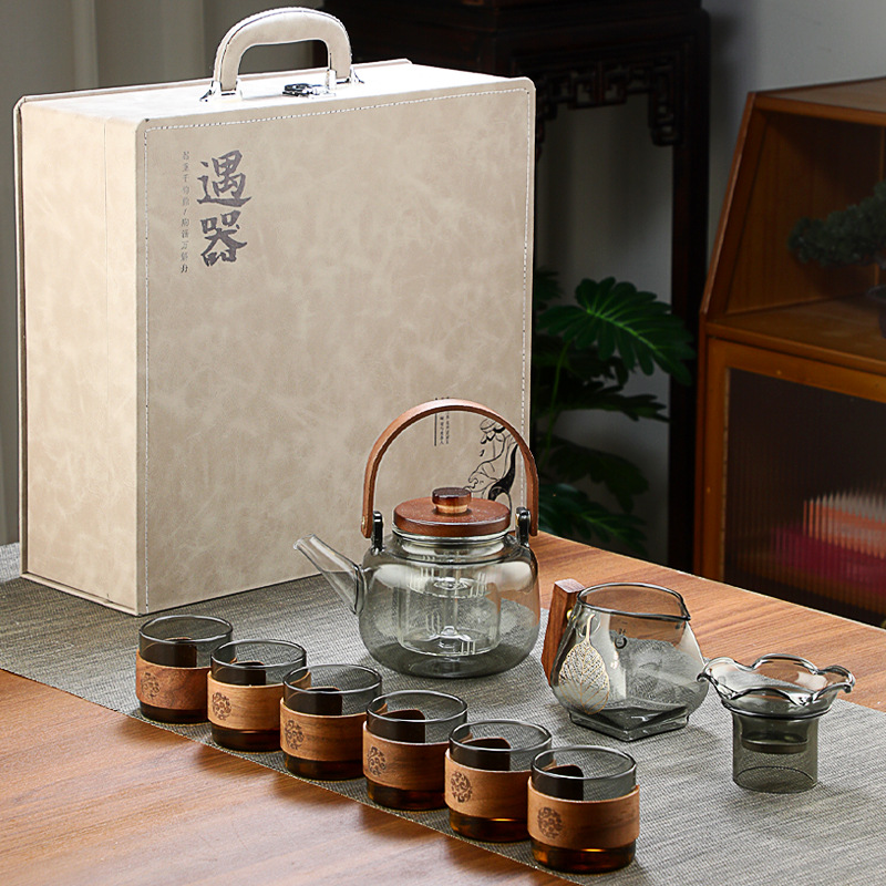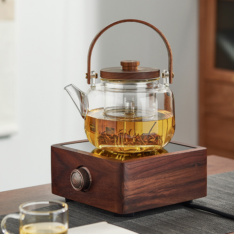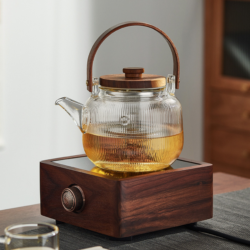 Плоский горшок + 6 поясных чашек + подстаканник + электрическая керамическая плита с древесной текстурой T12 + поднос для чая