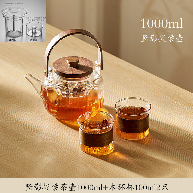【Подарочный набор】Прозрачный плоский стеклянный чайник (1 л) с 6 чашками + электрическая керамическая плита