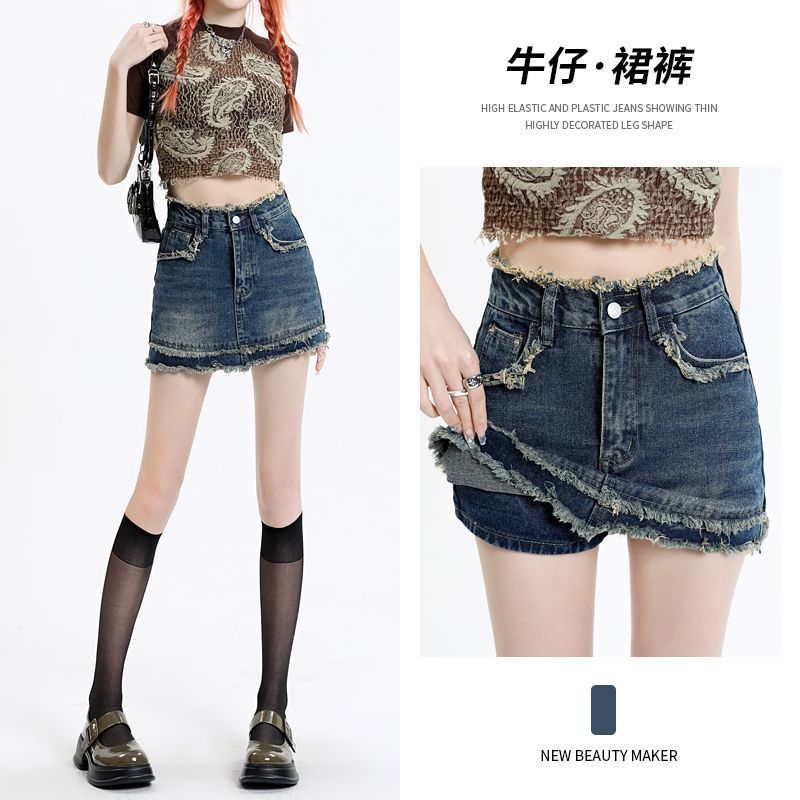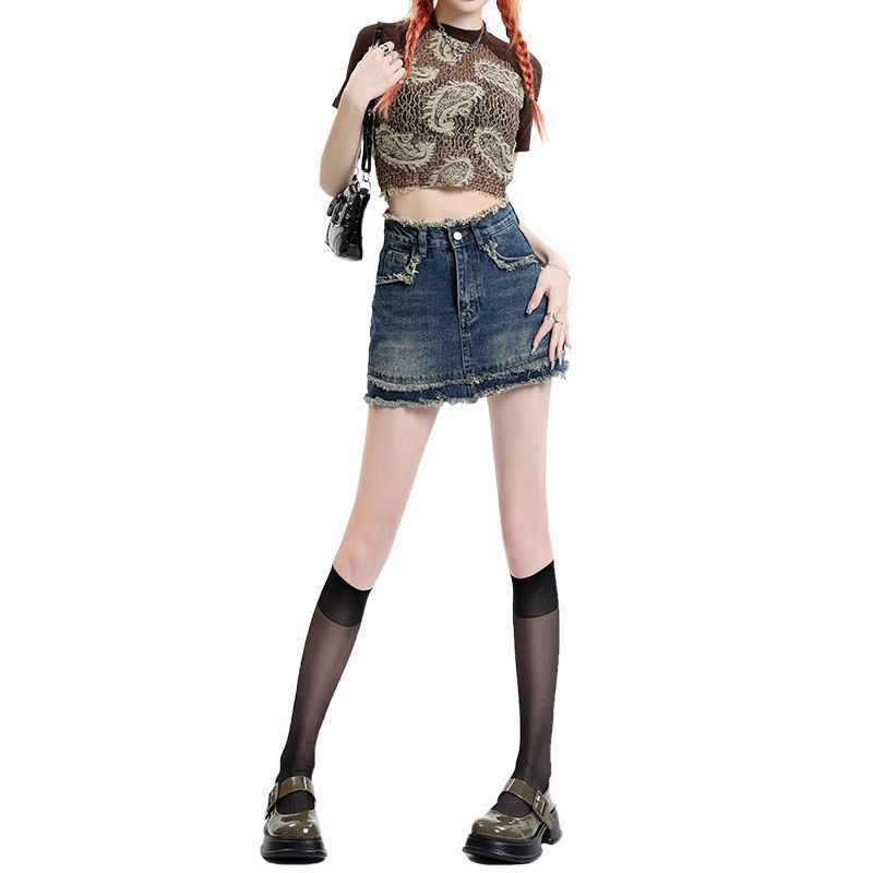 Юбка на половину половинки слова американская горячая девушка с бедрами и волосатыми краями ретро джинсовая юбка женская 2023 новая летняя тонкая