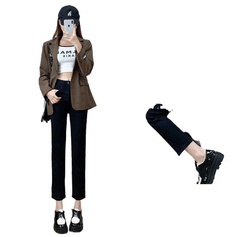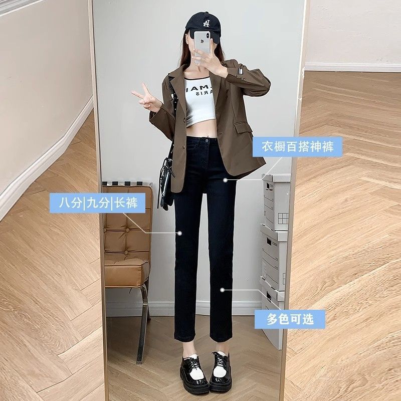 Трубочные брюки женские новые весенние и осенние зимние высокие талии тонкие большие размеры свободные девять очков маленькие черные прямые джинсовые брюки